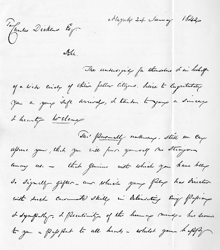[289] Mr. Grant Wilson has sent me an extract from a letter by Fitz-Greene Halleck (author of one of the most delightful poems ever written about Burns) which exactly expresses Dickens as he was, not only in 1842, but, as far as the sense of authorship went, all his life. It was addressed to Mrs. Rush of Philadelphia, and is dated the 8th of March 1842. "You ask me about Mr. Boz. I am quite delighted with him. He is a thorough good fellow, with nothing of the author about him but the reputation, and goes through his task as Lion with exemplary grace, patience, and good nature. He has the brilliant face of a man of genius. . . . His writings you know. I wish you had listened to his eloquence at the dinner here. It was the only real specimen of eloquence I have ever witnessed. Its charm was not in its words, but in the manner of saying them."