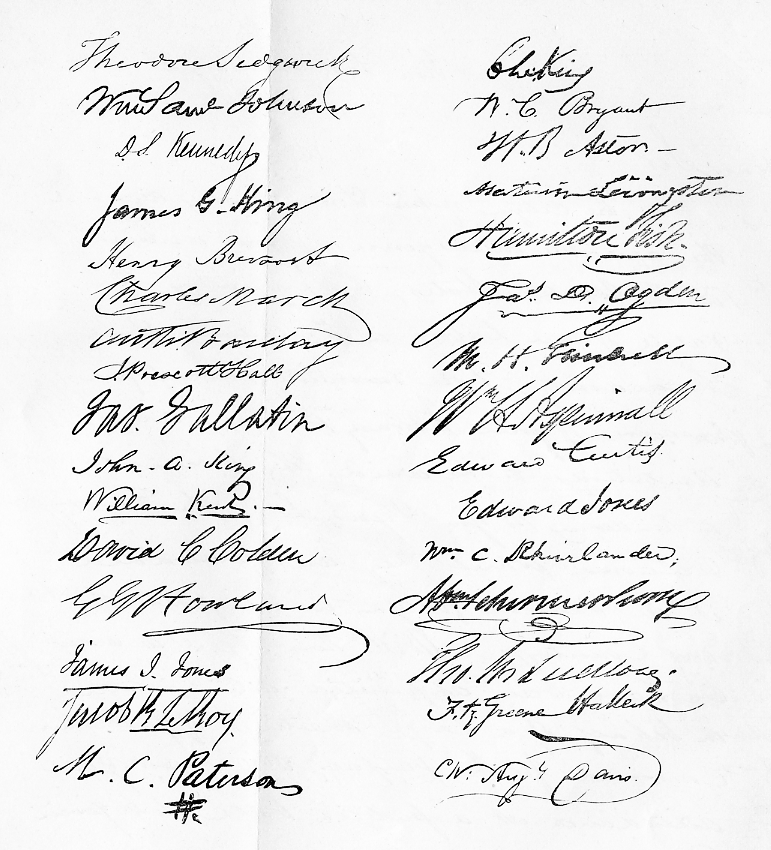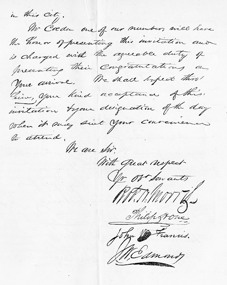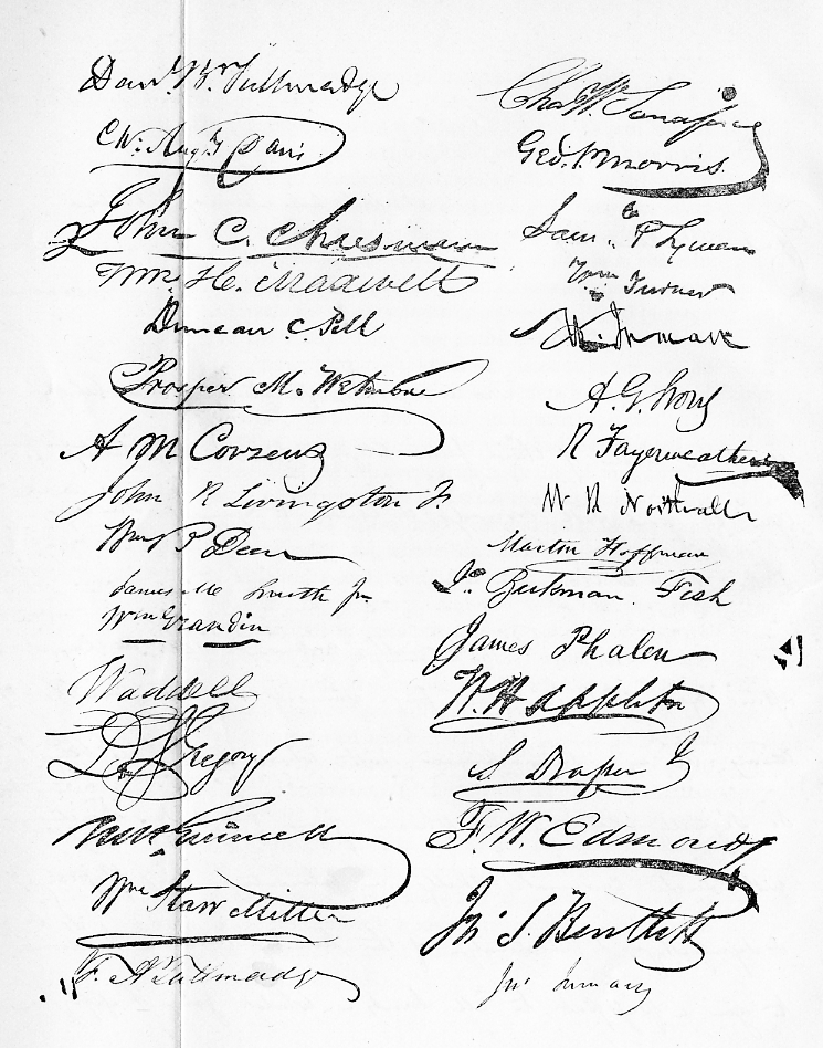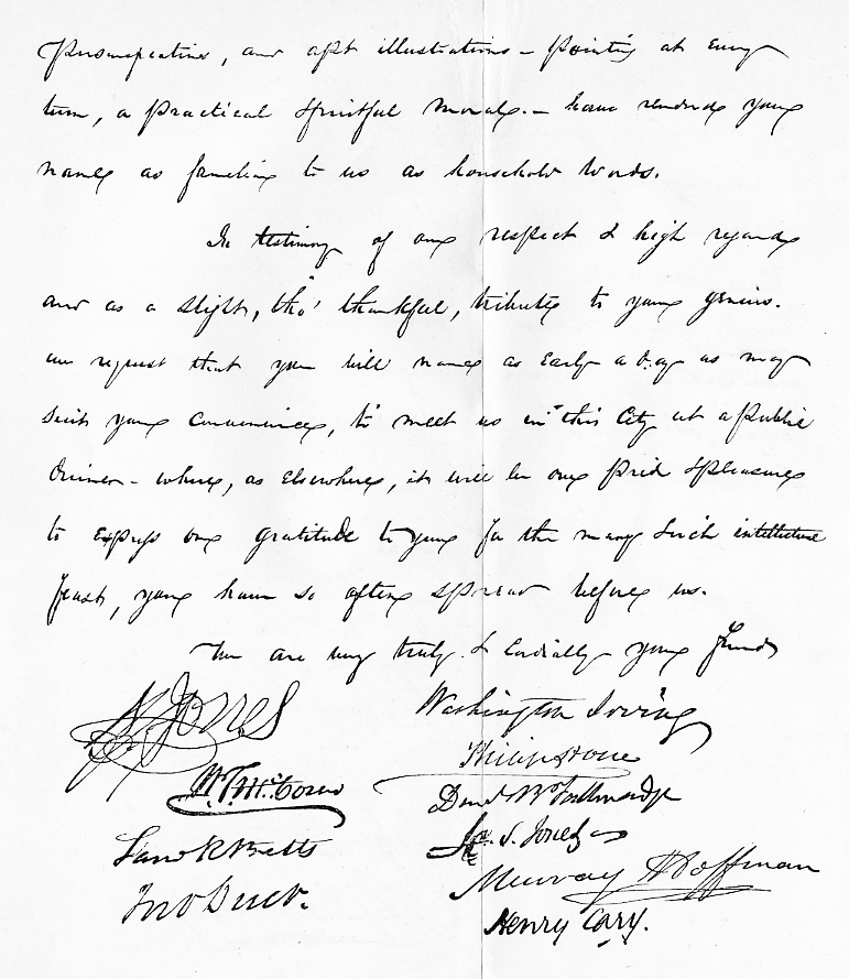 [280] Here is the newspaper account: "At about five o'clock on Saturday the hosts began to assemble, but at 5.30 news was received that the expected guest had succumbed to a painful affection of the foot. In a short time, however, another bulletin announced Mr. Dickens's intention to attend the dinner at all hazards. At a little after six, having been assisted up the stairs, he was joined by Mr. Greeley, and the hosts forming in two lines silently permitted the distinguished gentlemen to pass through. Mr. Dickens limped perceptibly; his right foot was swathed, and he leaned heavily on the arm of Mr. Greeley. He evidently suffered great pain."