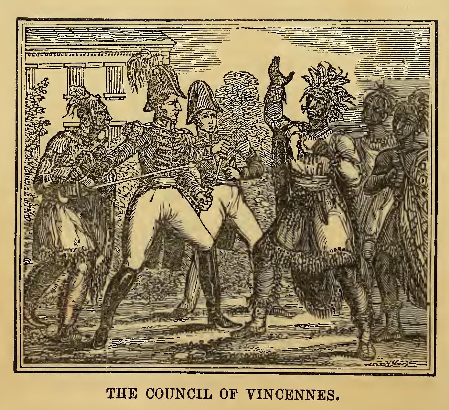 In 1809, Governor Harrison, agreeably to instructions from government, purchased of the Delawares, Miamis, and Shawanees, the country on both sides of the Wabash, and extending sixty miles above Vincennes. Tecumseh demurred to the sale, and Harrison, wishing to conciliate him, appointed the 12th day of August, 1810, as the time, and Vincennes, as the place, for holding a council to settle his claims. In this council, Tecumseh delivered a speech, which eloquently unfolded his views of the aggressions of the white men, and urged that the sale of the land was invalid, because not made with the consent of all the red men living upon it. After Tecumseh had concluded his speech, and was about to seat himself, he observed that no chair had been placed for him. Harrison immediately ordered one, and as the interpreter handed it to him, he said, “Your father requests you to take a chair.”