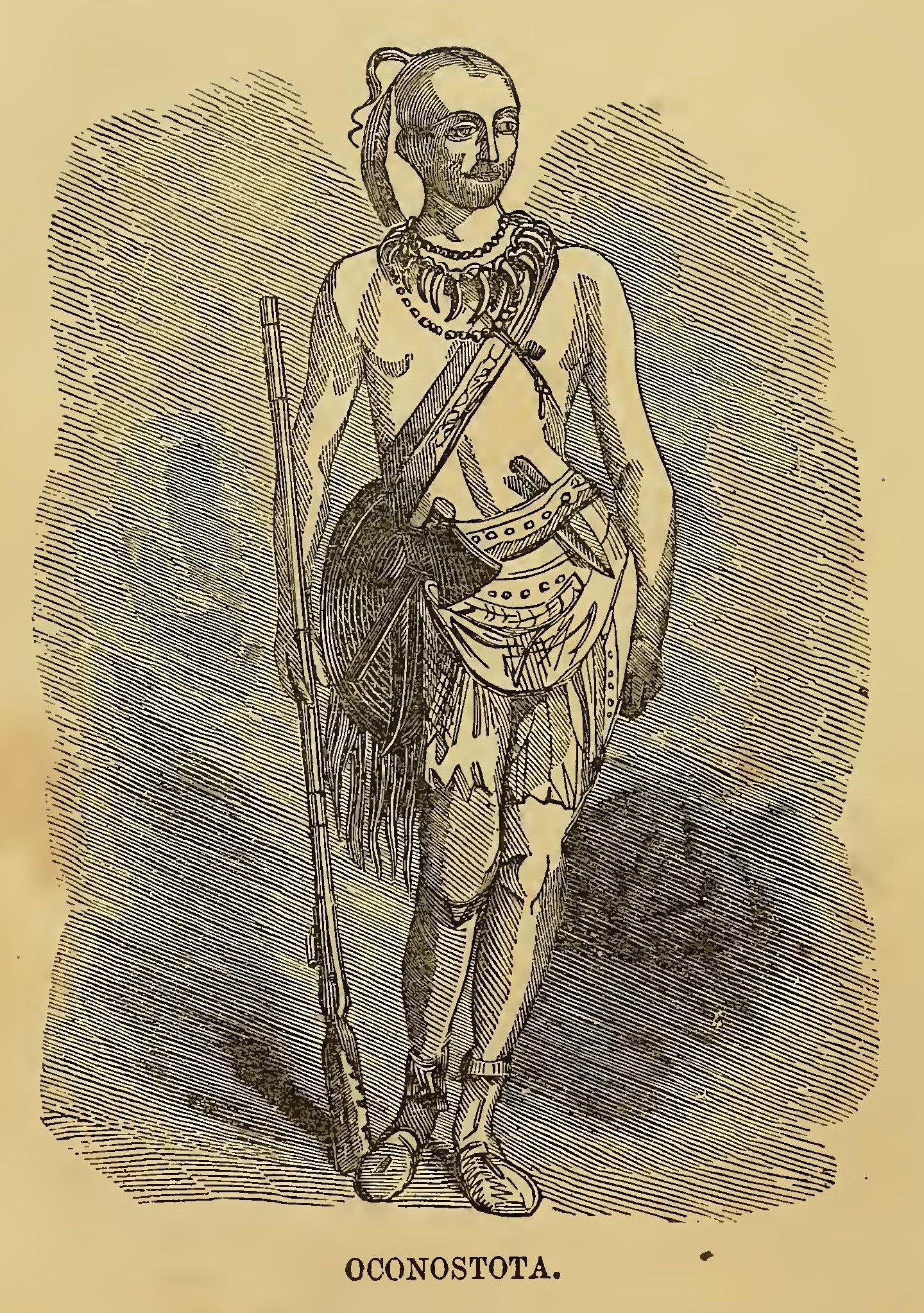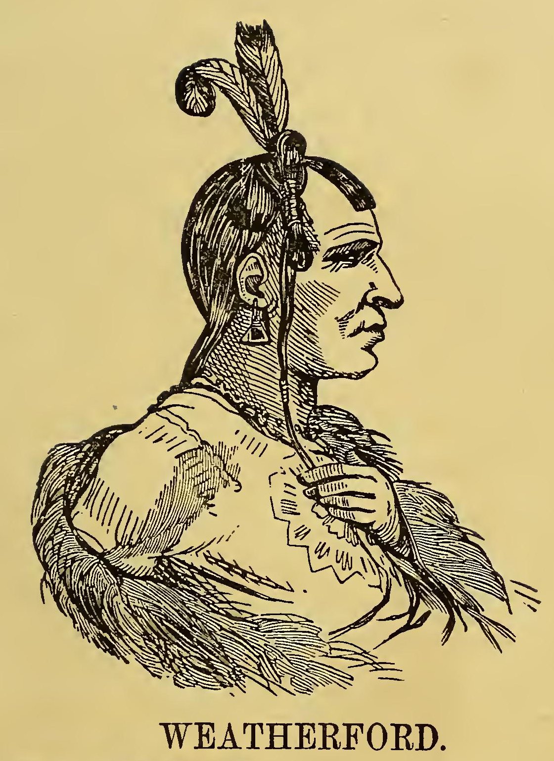Creeks during the war in which the power of that nation was broken and destroyed by General Jackson. In his character was found that union of great virtues and vices which has made up the character of many celebrated men among civilized nations. With avarice, treachery, lust, gluttony, and a thirst for blood, nature gave Weatherford, genius, eloquence, and courage. Seldom has an Indian appeared, more capable of planning and executing great designs. His judgment and eloquence secured him the respect of the old; his vices made him the idol of the young and unprincipled. In his person, he was tall, straight, and well proportioned; his eyes black, lively, and piercing; his nose aquiline and thin; while all the features of his face, harmoniously arranged, spoke an active and disciplined mind.