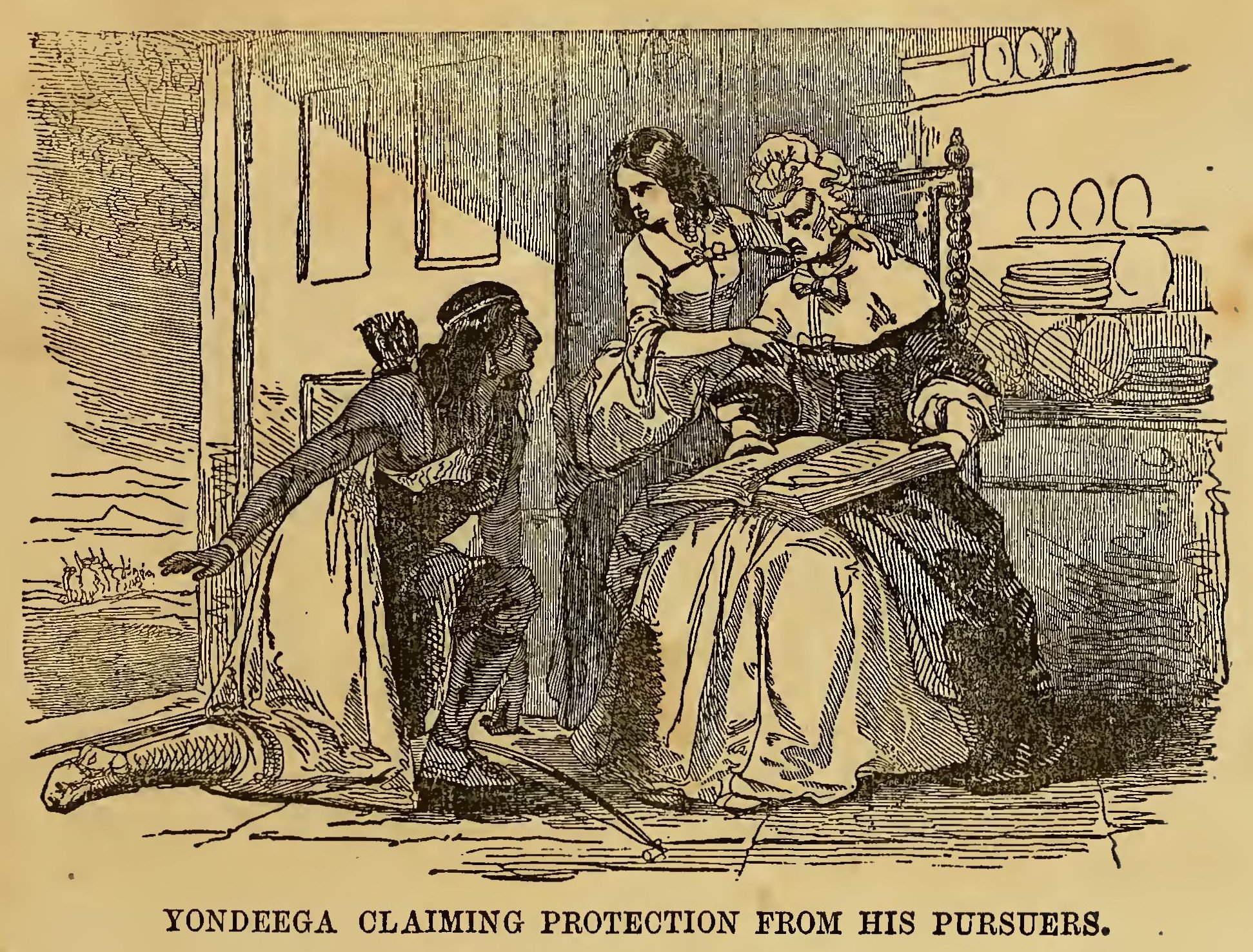The next day, Harold Dean and Pakanke went upon the hunt together, and the Indian took the earliest occasion, when they were alone, to explain to the Englishman the extent of his sister’s affection for him, and to demand that he should marry her. Harold endeavored to soothe the indignant feelings of the red man, and told him that he could love his sister, but could not marry her, as he had a wife already in England. Pakanke told him that he was deceitful; that he was a snake, whose bright colors lured simple maidens near that he might sting them; that he had seemed a friend, but to be a more deadly foe; and that he should marry Narra-mattah, or feel that the red man can revenge an insult as he can repay a kindness. He concluded in these forcible words: “Take to your wigwam, pale face, the maiden you have loved; keep and take care of the wild flower which you have sought and trained to await your coming, or the big wind shall hurl you to the earth!”