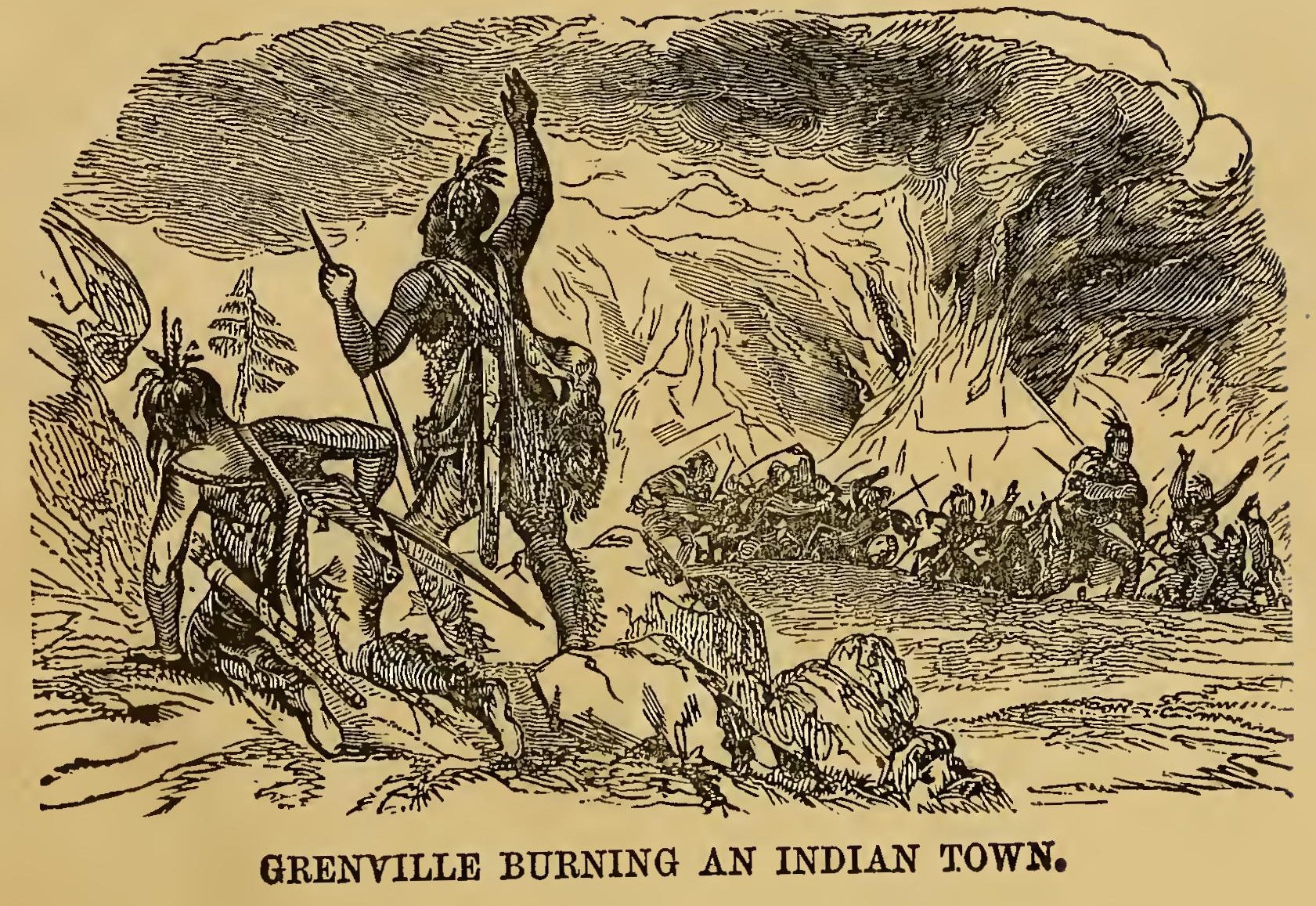 Soon after the return of Amidas and Barlow to England, Sir Richard Grenville intruded upon the territories of Wingina. It was he who committed the first outrage upon the natives, which excited their constant and deadly hostility. He made one short excursion into the country, during which, to revenge the loss of a silver cup, which had been stolen by an Indian, he burned a town. Grenville left one hundred and eight men to found a settlement on the island of Roanoke, and appointed Ralph Lane, governor. The English made several excursions into the country, in hopes of discovering mines of precious metal, of which the Indians, to delude them, spoke, and encouraged them to seek.