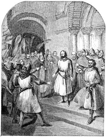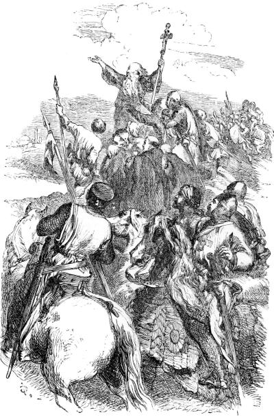 In the autumn of 1095, a little man, of mean aspect and eccentric manners, arrayed in a coarse woollen mantle, and mounted on a mule, rode about Europe, exhorting Christians to arm for the rescue of the Holy Sepulchre. Sometimes he preached in a church, or at the market-cross; at others, under a tree by the wayside; and wherever he went people crowded round him, hung on his eloquent words, and seemed delighted if they could touch the hem of his mantle, or pluck a hair from the mane of his mule. This remarkable man was known as Peter the Hermit, who had recently visited[Pg 235] Jerusalem as a pilgrim, and vowed to deliver the Holy Land from the domination of the Turks.