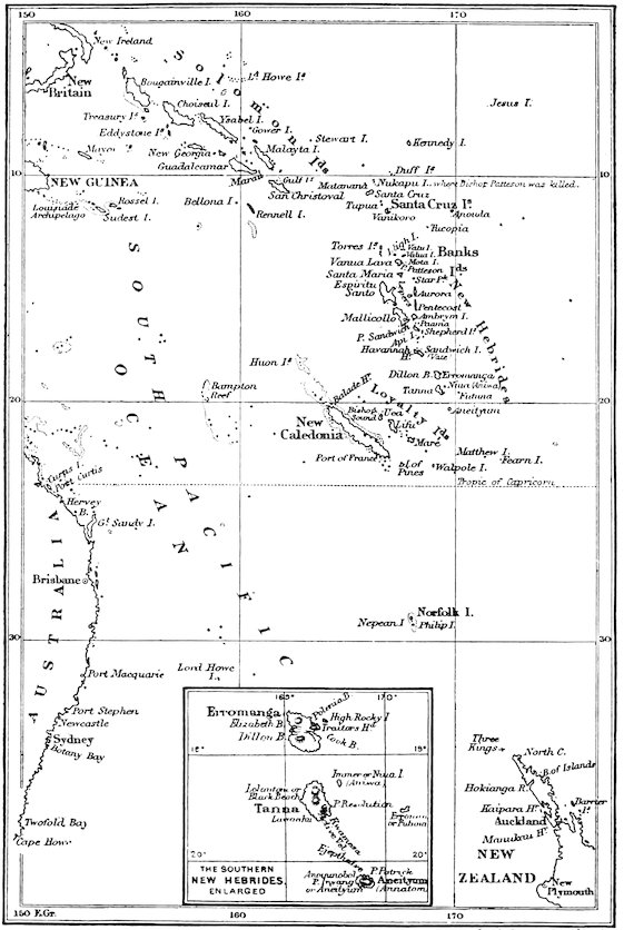 From Santo in the north to Aneityum in the south, a distance of about 400 miles, there are scattered over the Ocean thirty islands, twenty being well inhabited, and eleven of them being of considerable size, from Aneityum, which is forty miles in circumference, to Santo, which measures seventy miles by forty. The Islands lie 1,000 miles to the North of New Zealand, 1,400 miles North-East from Sydney, 400 miles West of Fiji, and 200 East of New Caledonia. The population is now estimated at 70,000; but, in the early days of Missions, before Traders and Kanaka-collectors, and the new Epidemics of Civilization (!) had decimated them, their numbers were certainly three times greater.