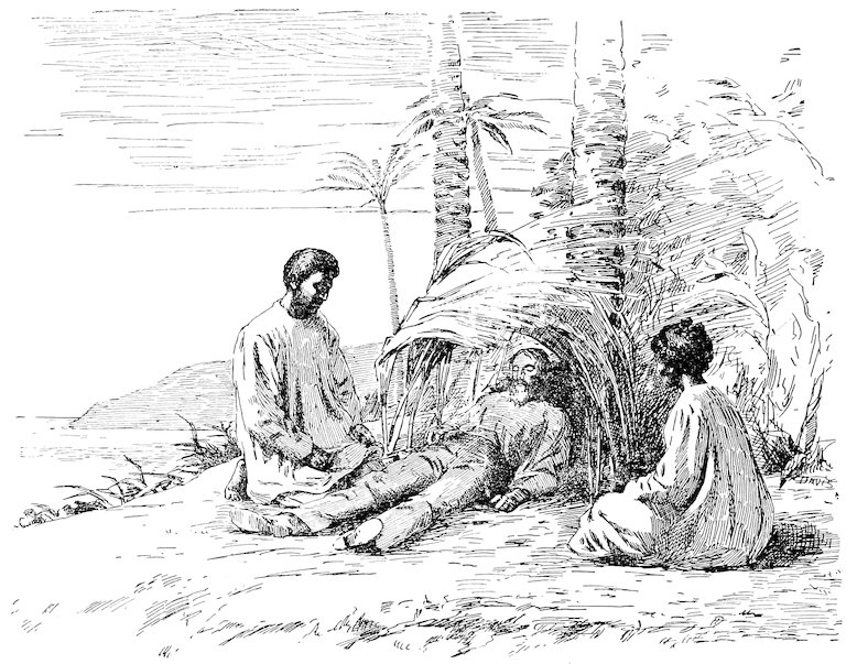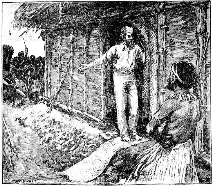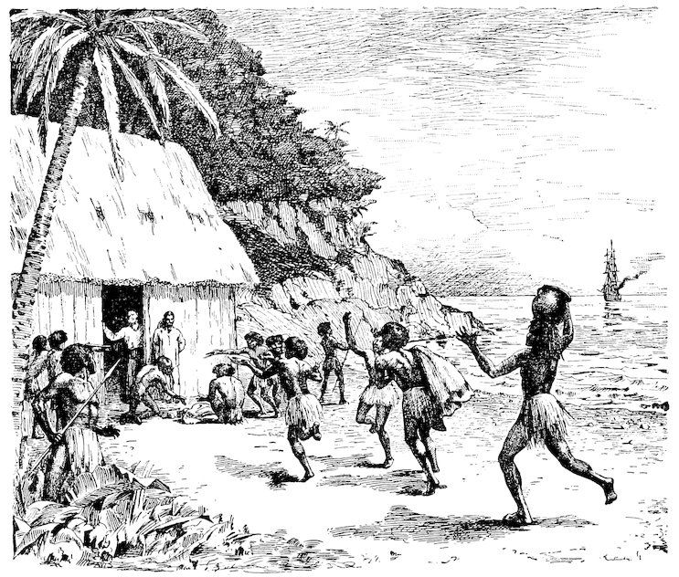 In the afternoon, Nowar and Miaki came off in a canoe to visit us. Nowar had on a shirt, but Miaki was naked and frowning. He urged me to go and see the Mission House, but as we had seen a body of men near it I refused to go. Miaki declared that everything remained as I had left it, but we knew that he lied. Old Abraham and a party had slipped on shore in a canoe, and had found the windows smashed and everything gone except my books, which were scattered about and torn in pieces. The armed men there wanted to kill the Aneityumese, but others said, “Not till we get Missi killed too!” They learned that Miaki had sold everything that he could sell to the Traders. The mate and men of the Blue Bell had on my very clothes. They boasted that they had bought them for a few figs of tobacco 353and for powder, caps, and balls. But they would not return a single shirt to me, though I was without a change! We had all been without food in the boat since the morning before, so Nowar brought us off a cocoa-nut each, and two very small roasted yams for the ladies. Those, however, only seemed to make our thirst the more severe, and we spent a trying day in that boat under a burning sun. Miaki said,—
