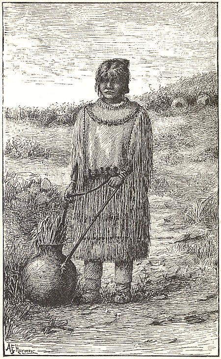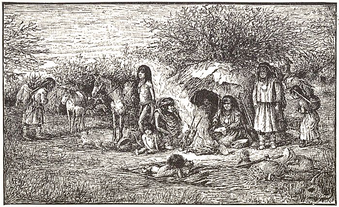 After two miles of a very hard climb we slid down the almost perpendicular face of a high bluff of slippery clay and loose shale into an open space dotted with Chiricahua huts, where, on a grassy space, the young savages had been playing their favorite game of mushka, or lance-billiards.