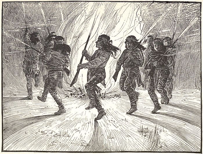 Animation and bustle prevailed everywhere; small fires were burning in secluded nooks, and upon the bright embers the scouts baked quantities of bread to be carried with them. Some ground coffee on flat stones; others examined their weapons critically and cleaned their cartridges. Those whose moccasins needed repair sewed and patched them, while the more cleanly and more religious indulged in the sweat-bath, which has a semi-sacred character on such occasions.