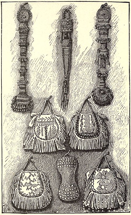 This is the equipment of each and every scout; but there are many, especially the more pious and influential, who carry besides, strapped at the waist, little buckskin bags of Hoddentin, or sacred meal, with which to offer morning and evening sacrifice to the sun or other deity. Others, again, are provided with amulets of lightning-riven twigs, pieces of quartz crystal, petrified wood, concretionary sandstone, galena, or chalchihuitls, or fetiches representing some of their countless planetary gods or Kân, which are regarded as the “dead medicine” for frustrating the designs of the enemy or warding off arrows and bullets in the heat of action. And a few are happy in the possession of priceless sashes and shirts of buckskin, upon which are emblazoned[26] the signs of the sun, moon, lightning, rainbow, hail, fire, the water-beetle, butterfly, snake, centipede, and other powers to which they may appeal for aid in the hour of distress.