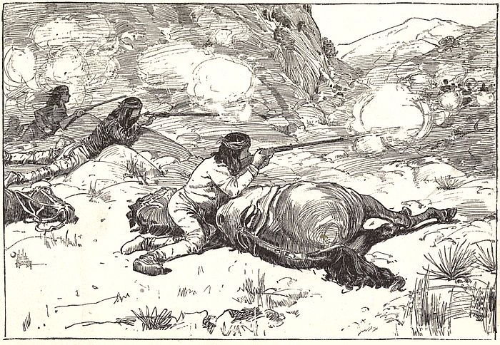 The first morning’s rest of the Apaches was broken by the shrill cry of Choddi! Choddi! (Antelope! Antelope!) and far away on the left the dull slump! slump! of rifles told that the Apaches on that flank were getting fresh meat for the evening meal. Twenty carcasses demonstrated that they were not the worst of shots; neither were they, by any means, bad cooks.