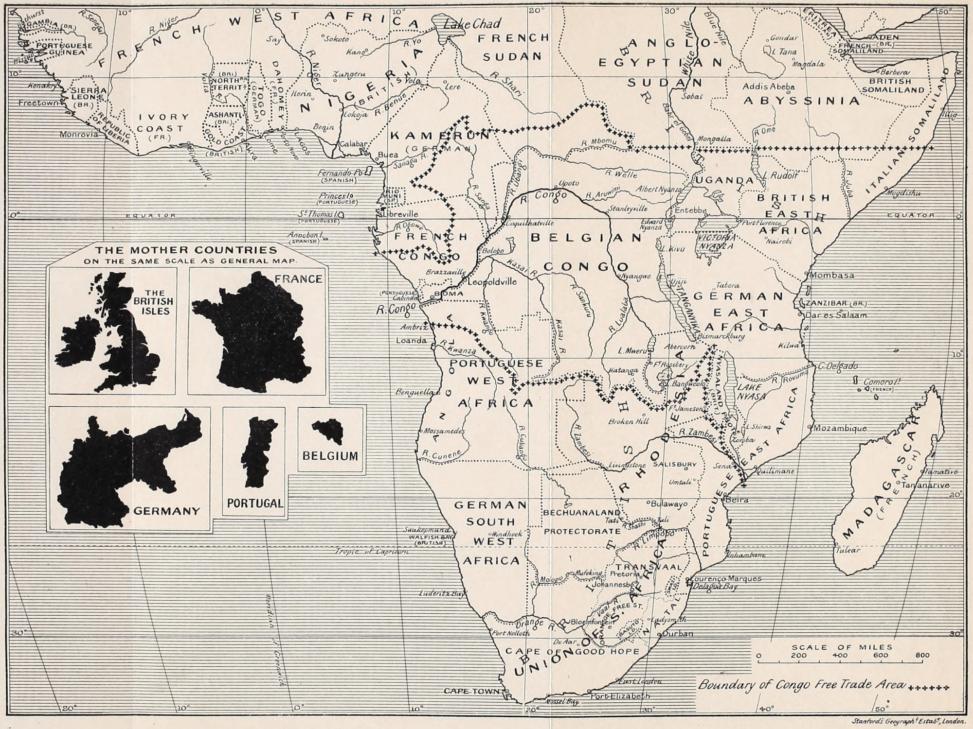 Mr. Harris is not sparing in his criticisms, neither does he withhold praise when he considers it is due. Whilst strongly condemning the slavery—for such it virtually is—that the Government of Portugal permits in its Colonies, he dwells (p. 296) on the “kindly nature” of the Portuguese themselves, and significantly adds “there is no colour-bar in the Portuguese dominions.”[3] He appears to find little to commend in French administration, and much (pp. 90 and 91) to condemn in their commercial policy. He does justice (p. 88) to the thoroughness and wisdom of the Germans in all matters connected with trade, and does not, as I venture to think, detract from the merits of the liberal policy which they have adopted by alluding to the fact that it is based on self-interested motives. On the other hand, he strongly condemns (p. 142) the German treatment of the natives. He dwells (p. 92) on the petty and vexatious obstacles placed in the way of a trade by the Belgian officials of the Congo, of which “even Belgian merchants complain,” and he has, of course, little to say in favor of Belgian administration in other respects. But he has the fairness to admit (p. 209) that since the annexation of the Congo by Belgium the death rate has diminished and the birth rate increased—a fact which, after the experiences of the Leopoldian régime, appears to me to be very eloquent, and to reflect much credit on the[xi] Belgian Government. Moreover, he tells us that “wherever the Belgian reforms have been most completely applied, there the ravages of sleeping sickness appear to be more or less checked.”