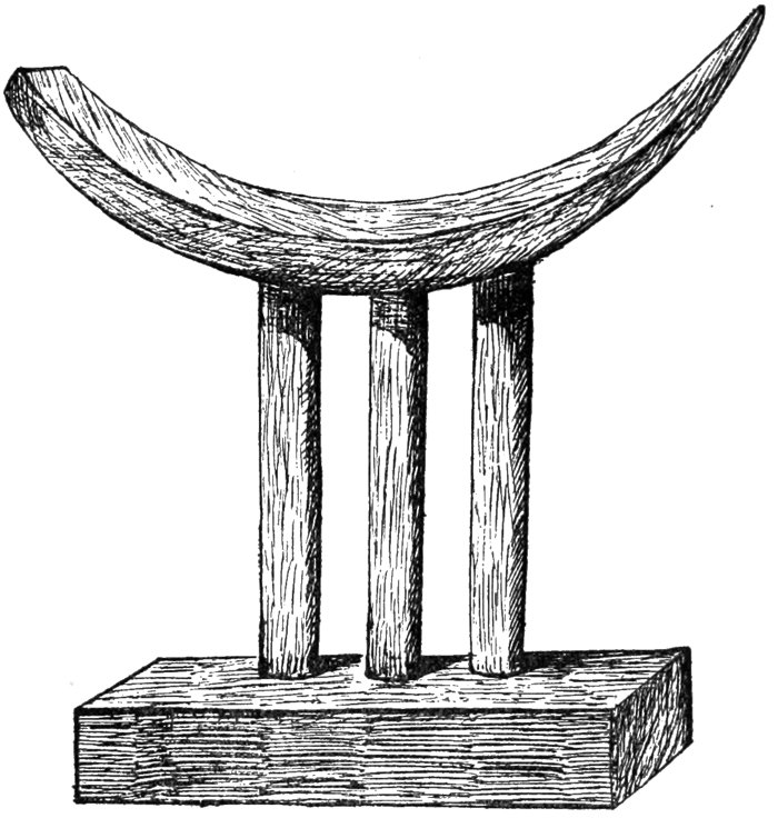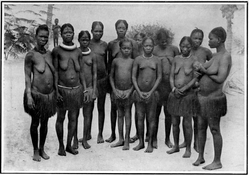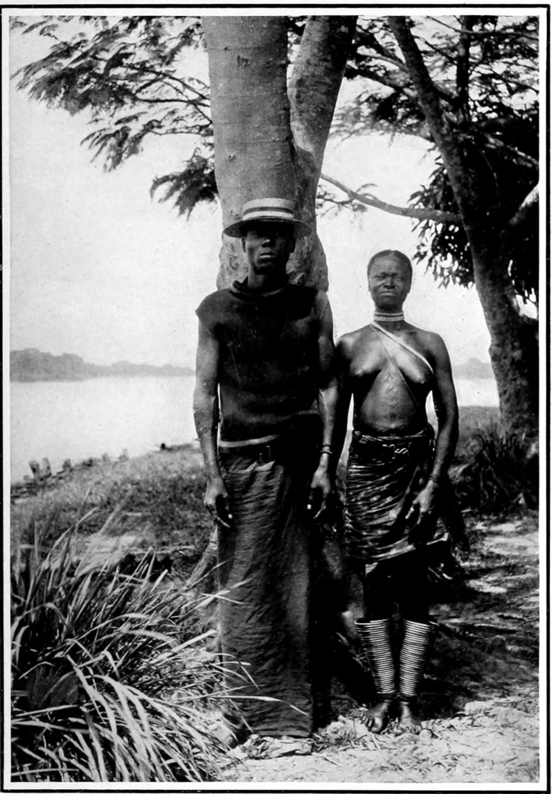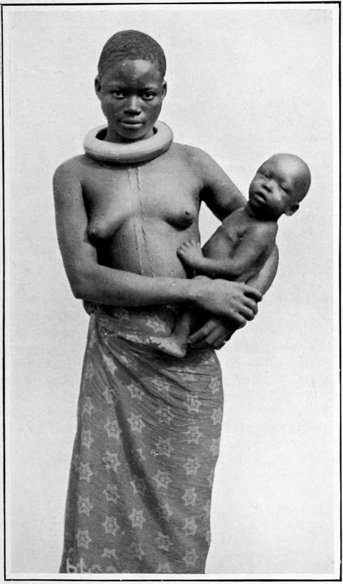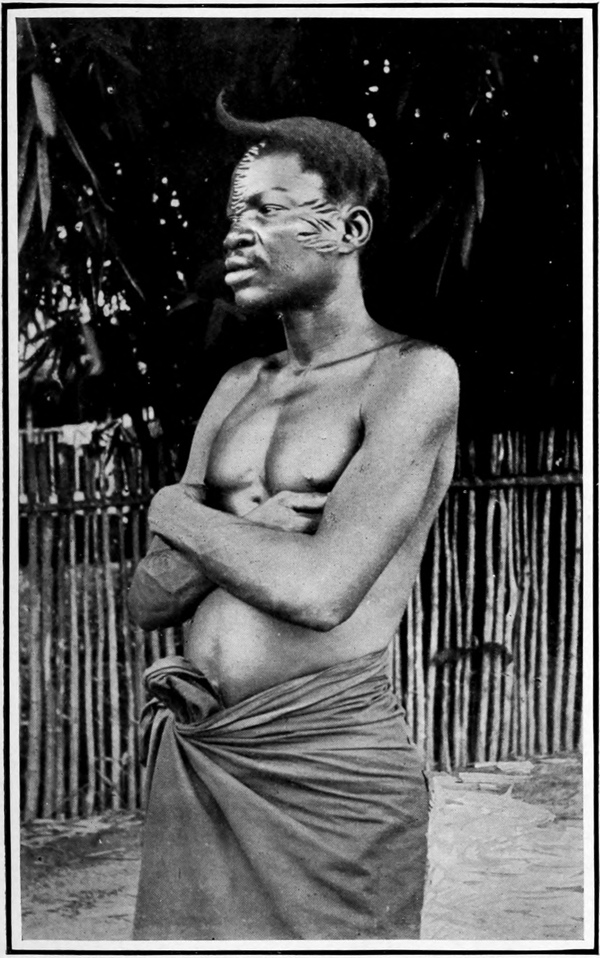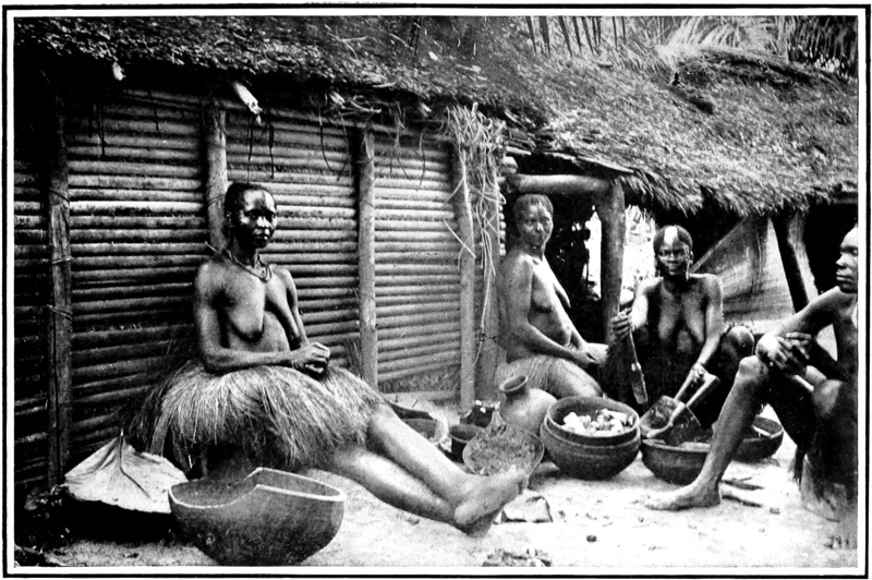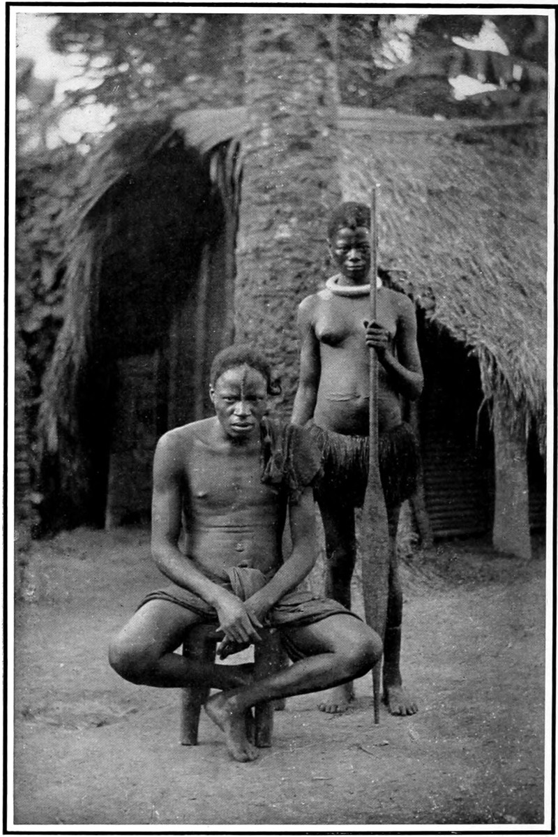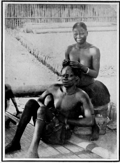 On arriving at the hut we saw, by the flickering blaze of the fire, a fine, well-proportioned woman of splendid physique. Her hair was arranged in a coiffure, coloured, stiffened, and kept in shape by being plastered with palm-oil, and the powder of burnt pea-nuts, or soot. It looked as though she wore a shining black fez on her head, slightly tilted backwards. She was probably a Bambala, or a Kiteke woman of that branch of the tribe that lived behind the riverine folk three hundred miles above Stanley Pool.