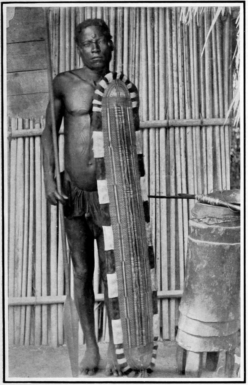 Notice the cicatrice on the man’s forehead and on the woman’s stomach. The brass ring round her neck in some cases weighs as much as 28 lbs. In her hand she is holding a paddle.