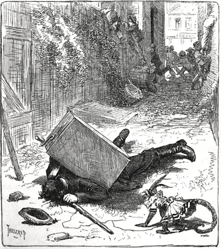 Benny Mallow had just reached home, with his heart away up in the top of his throat, and stuck there so tight that he was sure he could not swallow a mouthful, no matter how nice the dinner might be, 136when he saw, crossing his street, and at least a quarter of a mile away, three people, one of whom he was sure must be Paul. He shaded his eyes, looked intently for an instant, and then became so certain that it was Paul, whom he felt himself simply dying to see, that he forgot his heart and his dinner, and even the danger that might lurk in any one of a dozen places by the way; he even dropped his stick as he sped away as fast as he could run. By the time he reached the place at which he had seen the men the party was two squares farther to the left, and Benny was panting terribly; but as he now knew that it was indeed Paul whom he had seen, he continued to run.