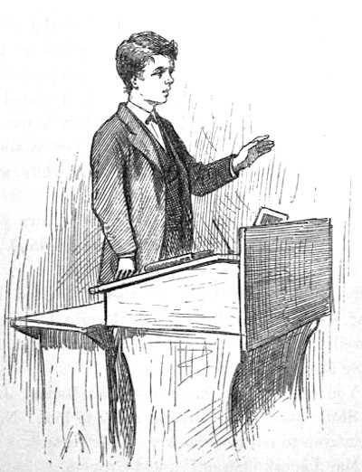 On one bright May morning, however, the boys who made this regular daily complaint were few; indeed, all of them, except Bert Sharp, who had three consecutive absences to explain, and no written excuse from his father to help him out, were already inside the school-room, and even Bert stood where he could look through the open door while he cudgelled his wits and smothered his conscience in the endeavor to frame an explanation that might seem plausible. The boys already inside lounged near any desks but their own, and conversed in low tones about almost everything except the subject uppermost in their minds, this subject being a handsome but rather sober-looking boy of about fourteen years, who was seated at a desk in the back part of the room, and trying, without any success whatever, to 11look as if he did not know that all the other boys were looking at him.