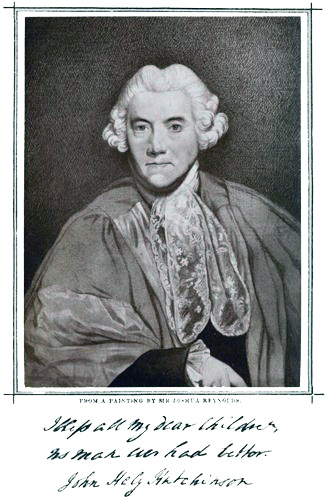 Philip Tisdall, in “Baratariana,” gives the following humorous description of Hutchinson: “He is jealous of me, and as peevish as an old maid. I love to tease him. I endeavour to put him on as odious ground as I can in parliament, and then I am the first to complain to him that Government should expose their servants to so much obloquy without occasion. I magnify to him the favours and confidence I receive from Government, and my correspondence with Rigby, which nettles him to the heart. He is too finical for Lord Townshend, who makes[Pg xvi] very good sport of him. One day he dined at the Castle, and when the company broke up, Lord Townshend, who pretended to be more in liquor than he was, threw his arms about his neck and cried out, ‘My dear Tisdall, my sheet anchor, my whole dependence! don’t let little Hutchinson come near me; keep him off, my dear friend; keep him off—he’s damned tiresome.’ At other times His Excellency makes formal appointments to dine at Palmerston[15] at a distant day. The Prime Serjeant invites all the officers of State; Mrs. Hutchinson is in a flurry; they send to me for my cook; and after a fortnight’s bustle, when dinner is half spoiled, His Excellency sends an excuse, and dines with any common acquaintance that he happens to meet in strolling about the streets that morning. This g’emman has a pretty method enough of expressing himself, indeed, but in points of law there are better opinions. My friend, the late Primate, who knew men, said, that the Prime Serjeant was the only person he had ever met with who got ready money, in effect, for every vote he gave in parliament. He has got among the rest the reversion of my Secretary’s office; but I think I shall outlive him.”[16]