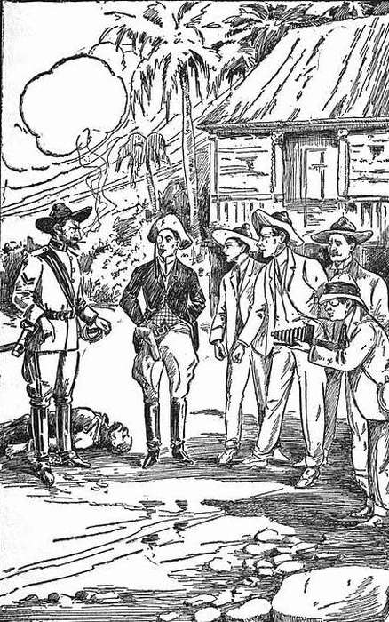 He pointed to the barrack gate where, pushing through the demoralized crowd of scared soldiers, came the well-known figure of Mr. Chester, followed by the stalwart Blakely, and Mr. Olivares the American Consul.