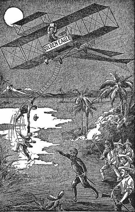 In the news that the revolution, the storm clouds of which had long been ominously rumbling had actually broken out, the boys had an intense and vital interest. Their father’s banana plantation, one of the largest and best known in Central America, lay inland about twenty miles from Greytown, a seacoast town, on the San Juan River. The boys were on their way there after a long and trying season of flights and adulation to rest up and continue, in the quiet they had hoped to find there, a series of experiments in aviation which had already made them among the most famous graduates the Agassiz High School on Washington Heights had turned out in its years of existence. Already in their flights at White Plains, and later during the Hudson-Fulton celebration, the boys had earned, and earned well, laurels that many an older experimenter in aviation might have worn with content, but they were intent on yet further distinction. Already they had given several trials to a wireless telegraph appliance for attachment to aeroplanes and the Golden Eagle in some private flights had had this apparatus in use. The results had been encouraging in the extreme. With the use of a greater lifting surface the boys felt that they would be justified in adding to the weight the aeroplane could lift and that this weight would be in form of additional power batteries for the wireless outfit both had agreed. In the boxes piled on the foredeck they had indeed a supply of balloon silk, canvas, wire, spruce stretchers and aluminum frames which they intended to put into use as soon as they should reach Nicaragua in the furtherance of their experiments. The conquest of the air both in aviation and communication was the lofty goal the boys had set themselves.
