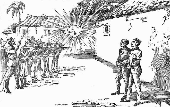 The firing squad, had their fingers on their triggers when,—with a crash that caused them to drop their weapons in sheer amazement,—a shell ripped through the roof of the garrison trial room from which Rogero stood sombrely watching them. It exploded the next moment with a force that showered the boys with splinters and debris and killed several of the firing squad outright.