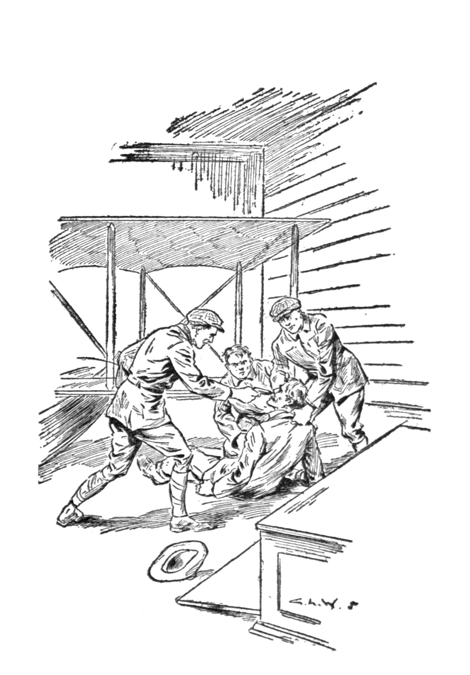 Pudge, with a trembling hand, managed to insert his key, and upon the door being opened the three boys hurried inside the curious elevated hangar. It had been built with a metal roof, though whether this would really prove bombproof in case of a German air raid, such as had occurred several times, was a question.