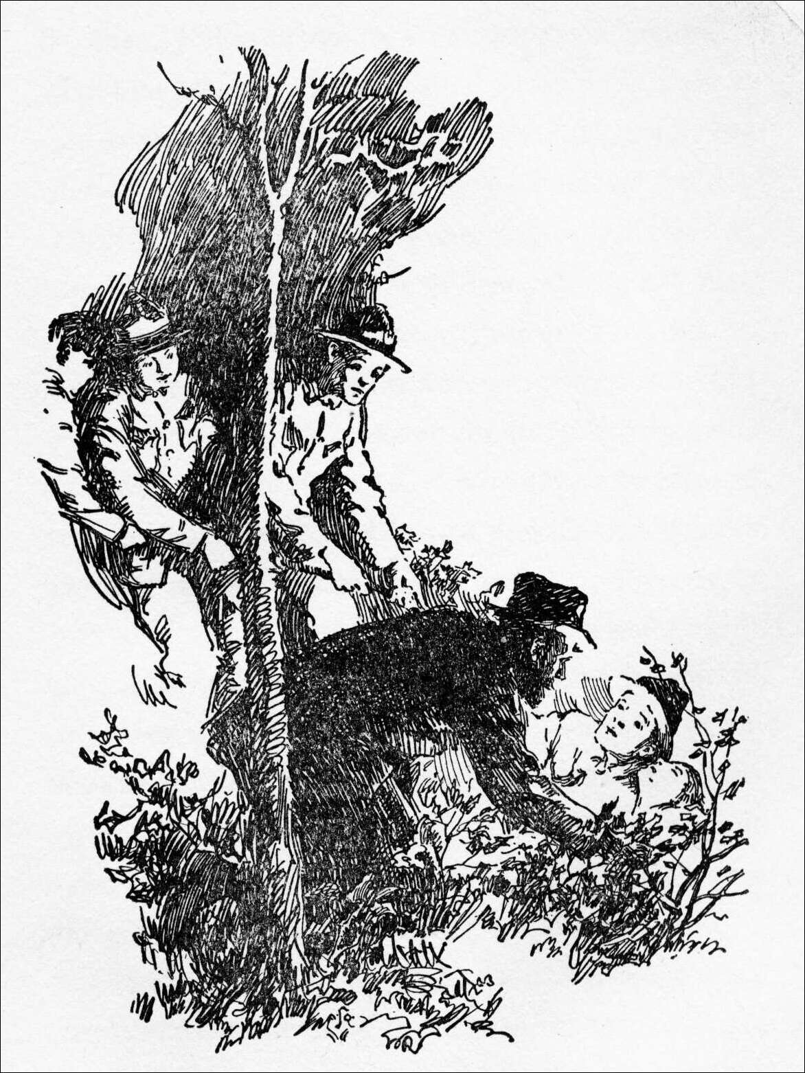 They were still sitting there on the porch about the middle of the afternoon, feeling that they might as well finish that day by doing next to nothing, when a cloud of dust down the road caught their attention. Soon afterwards they made out several cars heading their way. To the surprise of the boys these turned in at the lane leading up to the Jeffords’ farmhouse.