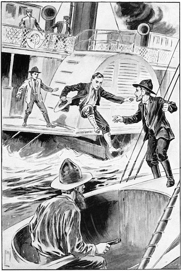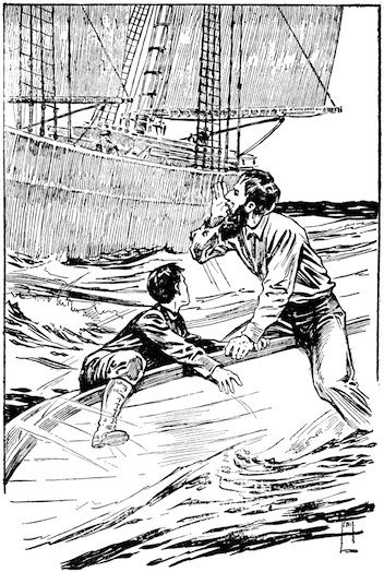 “HERE GOES!” JACK LEAPED FORWARD AND OUTWARD. HE LANDED RIGHT ON THE SLOOP’S DECK.—Page 43.