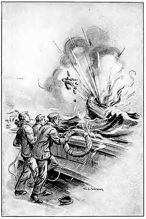 297The model and the plans of the wireless torpedo were recovered, and Ding-dong sent a message winging eastward to Professor Jenkins informing him of their safety. We perhaps may look ahead a little here and inform our readers that before many months had passed the Jenkins Wireless Torpedo was an accomplished fact, with headquarters on Goat Island. Prominent in the company formed to promote it were Nat Trevor, Joe Hartley, and William Bell.