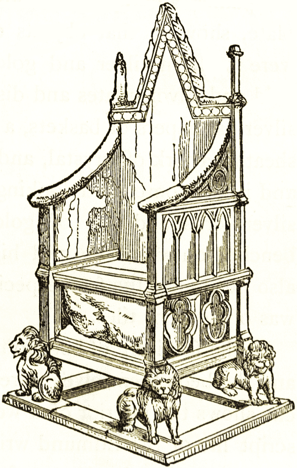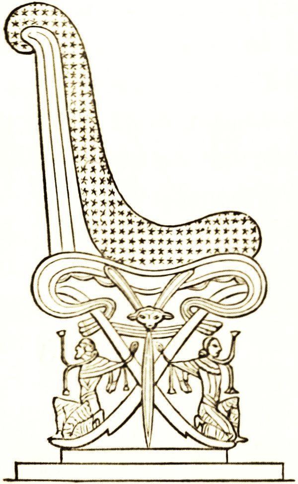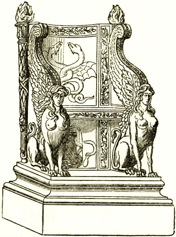 According to Mr. Layard, the chair represented in the earliest monuments is without a back, and the legs tastefully carved. This form occurs in the palace of Nimrúd, and is sculptured on one of the bas-reliefs now in the British museum. Often the legs ended in the feet of a lion or the hoofs of a bull, and were made of gold, silver, or bronze. "On the monuments of Khorsabad and by the rock tablets of Malthaiyah we find representations of chairs supported by animals and by human figures, sometimes prisoners, like the Caryatides of the Greeks. In this they resemble the arm-chairs of Egypt, but appear to have been more massive. This mode of ornamenting the throne of the king was adopted by the Persians, and is seen in the sculpture of Persepolis." The woodcut represents such a chair, from a bas-relief at Khorsabad. The lion head and lion foot were used by other oriental nations. The throne of king Solomon was supported by lions for arms, probably in the same position as the horses in the Khorsabad chair; and lions of gold or chryselephantine work stood six on each side on the six steps before the throne.