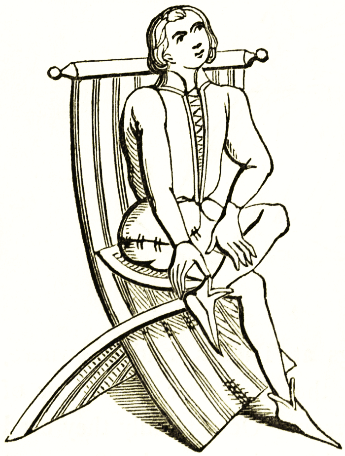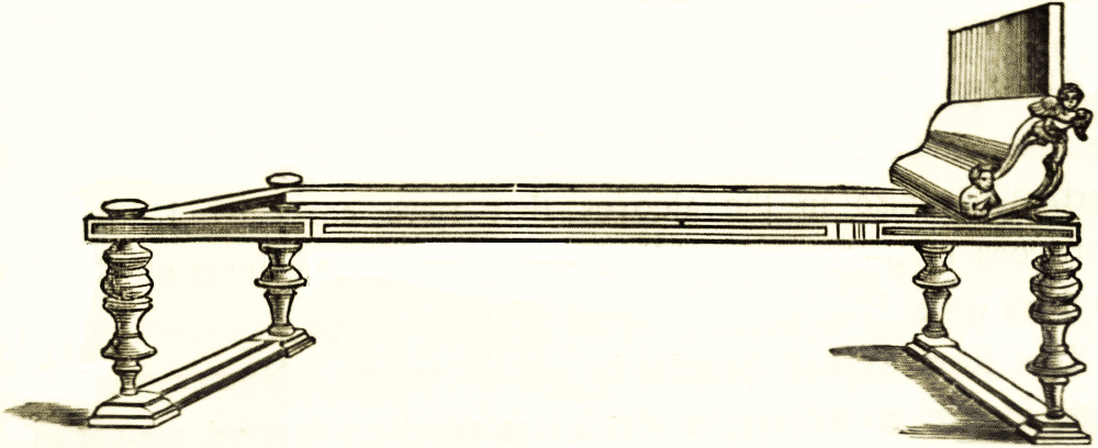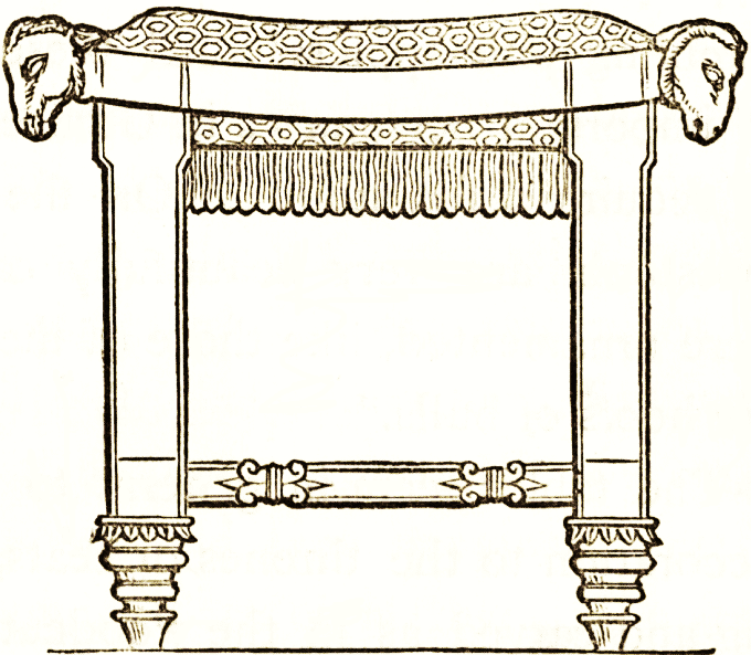 This woodcut is of the sella, a seat or couch, made of wood, with turned legs; it is intended, probably, for one person only, and has no need of a footstool. It has been covered with a cushion.
