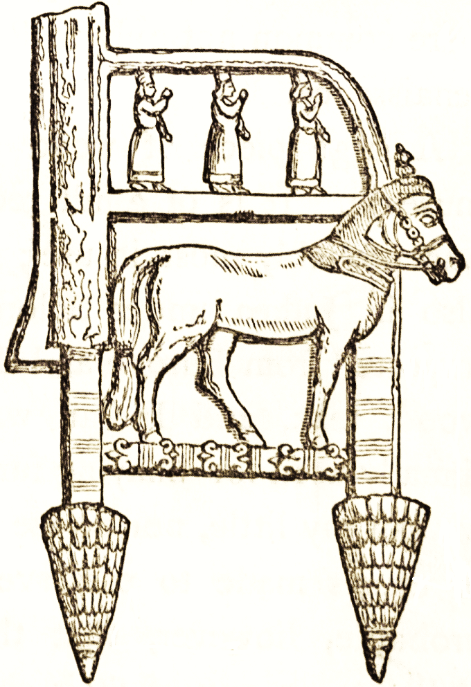 "Ornaments," says Mr. Layard, "in the form of the heads of animals, chiefly the lion, bull, and ram, were very generally introduced, even in parts of the chariot, the harness of the horses, and domestic furniture." In this respect the Assyrians resembled the [pg 7] Egyptians. "Their tables, thrones, and couches were made both of metal and wood, and probably inlaid with ivory. We learn from Herodotus that those in the temple of Belus in Babylon were of solid gold."