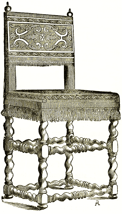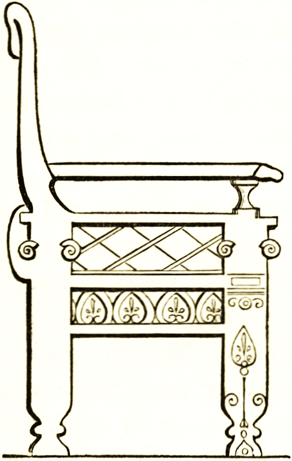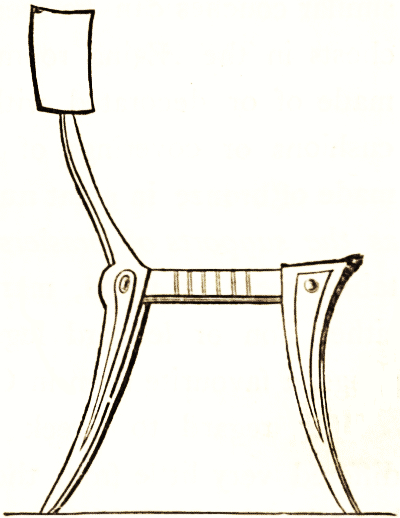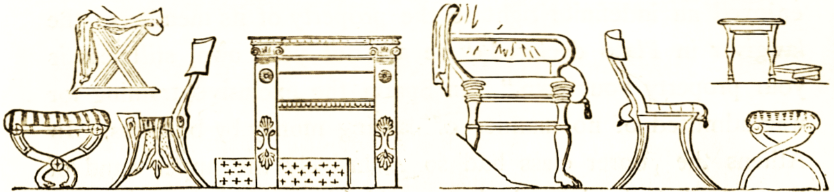 The chairs were of different kinds and were used for various occasions. The atrium contained double seats, single seats, and benches to hold more than one sitter; chairs that either folded or were made in the form of folding chairs, such as could be carried about and placed in the chariot, curules. The woodcut shows the general fashion of a state or ceremonial chair; from the marble example in the Louvre.