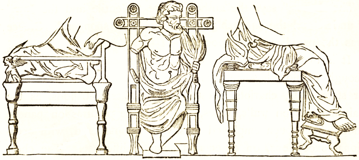The Greeks used couches for sleeping and resting upon, but not for reclining on at meals, till the Macedonian period. We give two or three examples, from marbles: one of which resembles [pg 13] the modern sofa. Women sat always, as in Rome, sometimes on the couch at the head or foot, on which the master of the house or a guest reclined, generally on chairs. Besides chairs like the one represented here, the Greeks made arm-chairs; and folding chairs of metal. In the Parthenon frieze Jupiter is seated in a square seat on thick turned legs, with a round bar for a back, resting on short turned posts fitted into the seat. The arms are less high than the back; they are formed by slight bars framed into the uprights at the back, and resting on winged sphinxes.