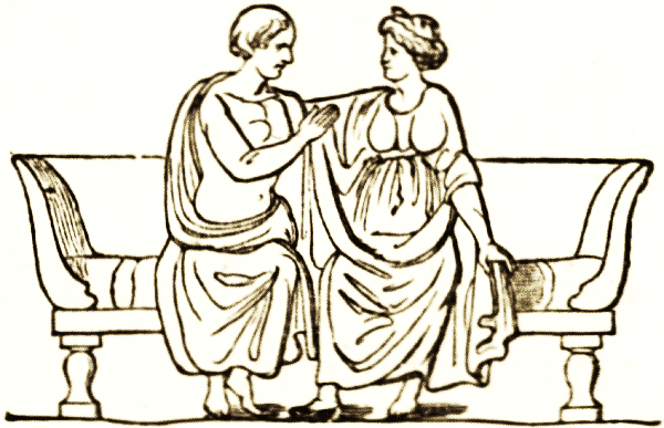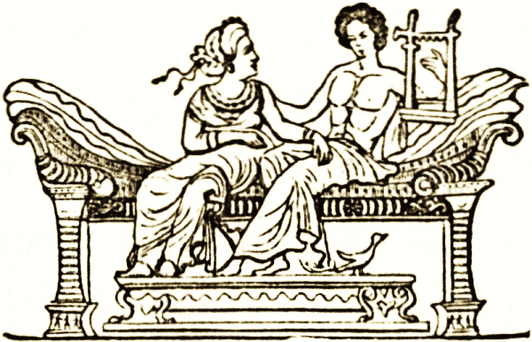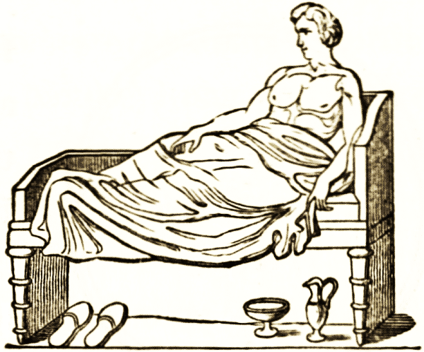 The Roman patricians and their ladies sat on chairs and reclined on couches when not at meals. In the atrium under the broad roofed corridors, and in the halls not used for eating, were couches, such as the couch of which we give a woodcut, of bronze or of precious woods; the bronze damascened with ornaments of [pg 28] the precious metals, or of metal amalgam; the wood veneered or inlaid with marquetry or tarsia work of ivory, ebony, box, palm, birds'-eye maple, beech, and other woods.