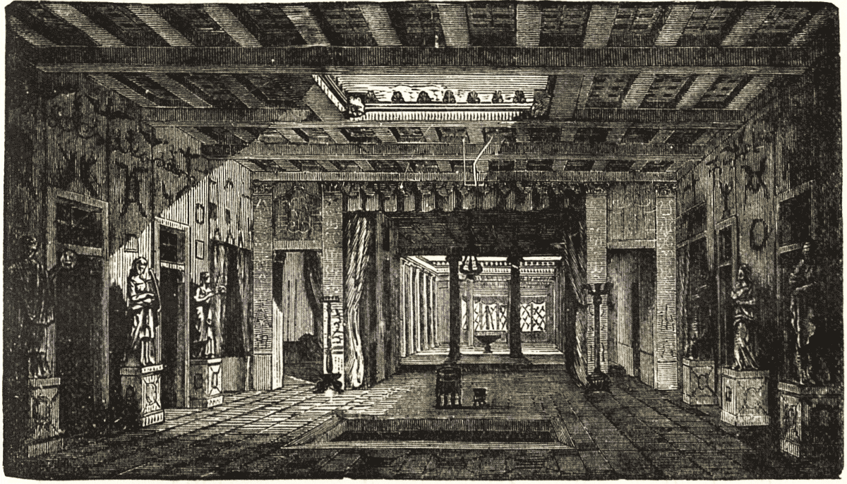 Inside the atrium was the nuptiale, the nuptial bed, and here were kept in earliest times the penates, household or family divinities, and the family hearth, though these sacred emblems were banished in the imperial times to distant parts of the house, and statues between the columns that supported the central roof supplied their place. The atrium was the general reception-room, like the hall in mediæval houses, but not the dining-room. To this succeeded an inner open court, with porticoes or corridors running round, supported on columns, and with a fountain or basin, shrubs and flowers in the centre, like the courts of the Alhambra. This court provided four halls in the four corridors, which could be screened off by tapestries and curtains. The centre was shaded in summer by canvas or carpet awnings. In winter a wooden roof could be pushed over the open space. Between the two halls or courts was a chamber called the triclinium, or dining-room. These rooms were roofed with timber richly painted and gilt. The roofs either hung on beams projecting [pg 19] from the walls, or were supported by pillars, or were carried up to a high opening, sloping back to the walls so as to admit more light to the rooms, alcoves, or screened portions furthest removed from the opening. Occasionally they were covered in wholly with a testudo-shaped roof, and in such cases lighted, perhaps, by dormers, though it is not quite clear how light was provided for in such constructions. Roman rooms were not floored with boards but paved with marble in large pieces, or in mosaic work made of small dies or squares. Coarse specimens of such work manufactured in our own times are laid down in the museum at Kensington, and fragments of the old work may be seen there on the walls. Occasionally these mosaics represent the house watch-dog chained, or the fable of Ganymede, or hunting scenes, sometimes finished with the utmost nicety. The triclinium took its name from the three couches or sofas, on each of which three persons reclined during meals. Later, and in sumptuous palaces, several dining-rooms were built out beyond the inner courts. The engraving, a reconstruction, will give a fair idea of the general character of a richly furnished Roman [pg 20] house. First, is the atrium, into which smaller chambers open; next, the triclinium, to the left of which is a cabinet; and beyond is the peristylium, with its lofty colonnades. This last apartment was large and open; often planted with shrubs and trees, or containing statues, flowers in pots and vases, and surrounded by a corridor. As these courts were of various sizes they were, no doubt, in Rome on a scale out of all proportion to those found at Pompeii; were fewer or more in number, and rooms were added as the proprietor could acquire ground for building, often a difficulty in the older parts of the city. Something of this ground plan survives in a few of the very ancient Roman churches, as in that of S. Pudenziana, formerly the house of the senator Pudens, with vestibules, open courts, &c.