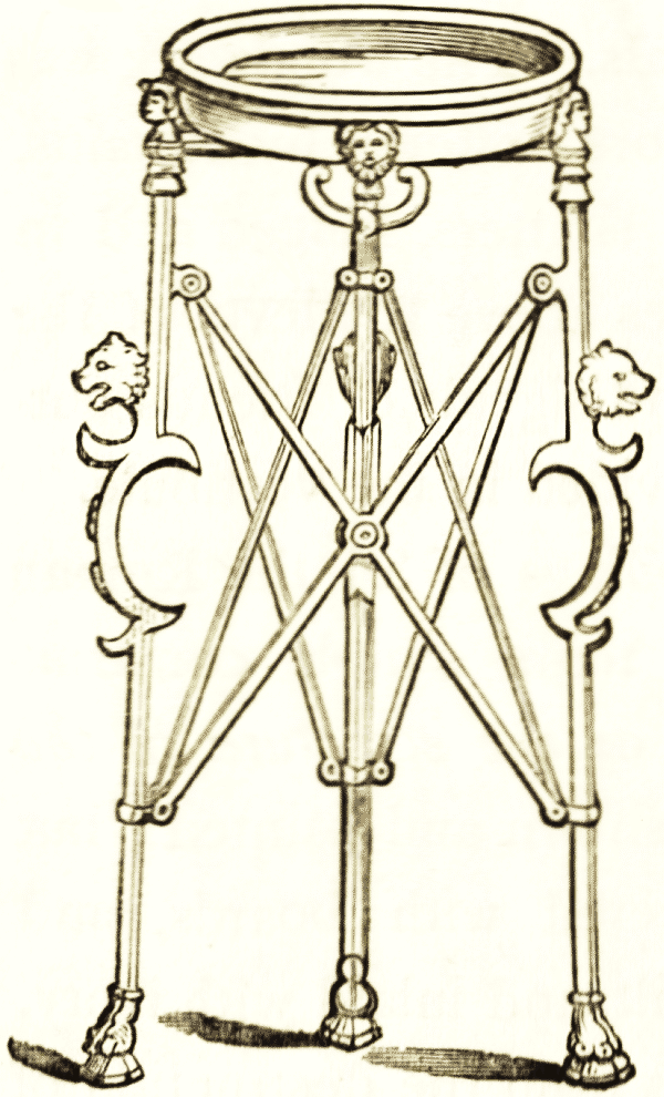 Among the ornamental pieces of furniture were tripods, three-legged frames, forming the supports of tables, of altars, of braziers, sometimes of pieces of sculpture. These were generally of bronze, and original pieces obtained in various parts of Italy can be seen in the bronze room [pg 23] of the British museum. Some of these much exceed the height of high modern tables. They are light, and ornamented on the upper ends with animal or other heads; some with the beginning of a hind leg about halfway down. They were, however, frequently movable, and, like the piece in the cut on the preceding page from an example in the British museum, were made to contract by folding; the stays which connect the legs internally slipping up and down them by means of loops. Such pieces might serve as table legs, or would hold altar pans or common fire pans or support pots of flowers.