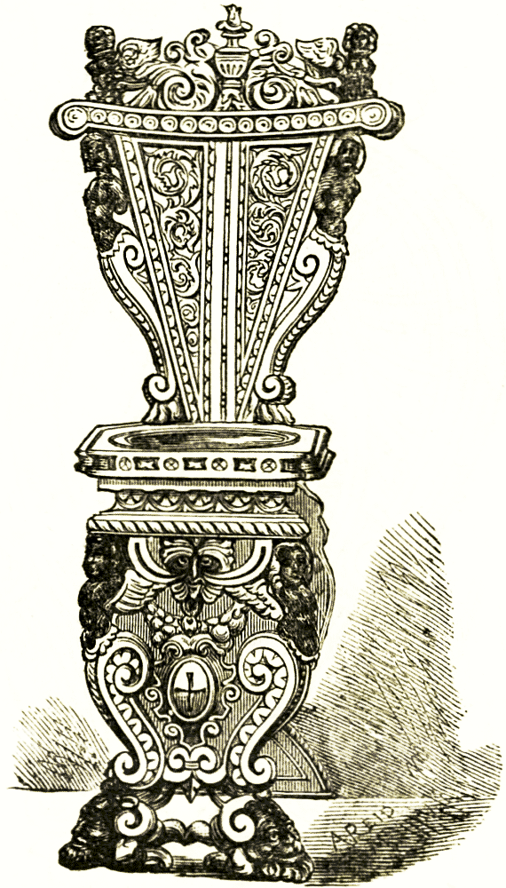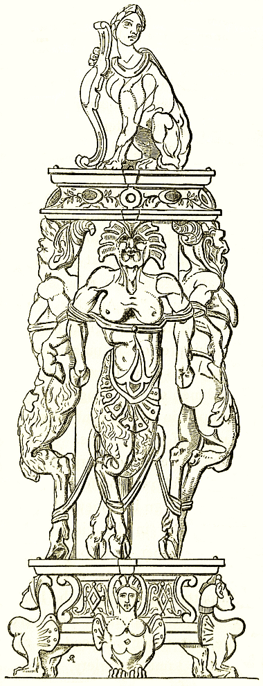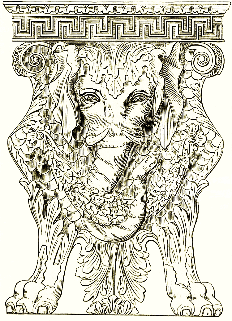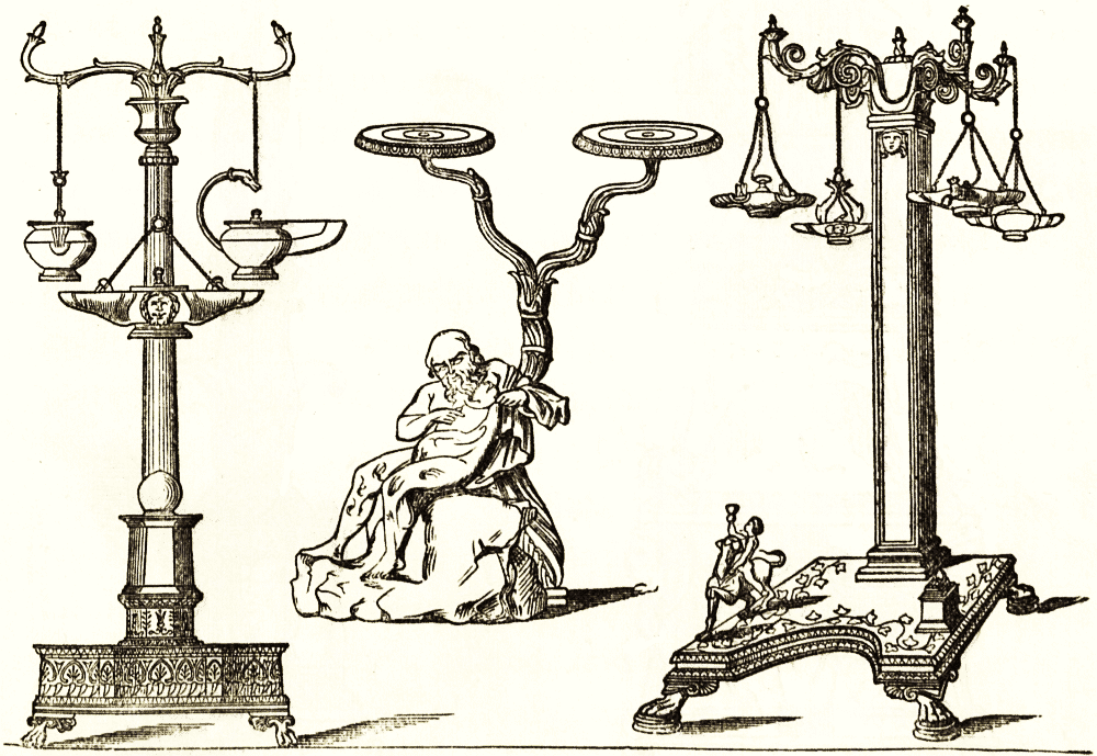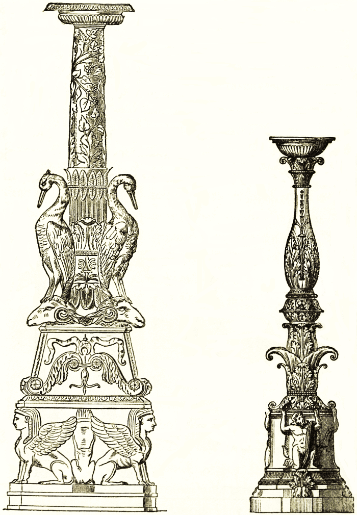 Besides tripods the reception rooms were ornamented with candelabra on tall stands of most graceful form and proportions. It will suffice to point to more than a dozen of examples in the British museum; and the woodcuts are from examples in other collections. The stems are a fluted staff or a light tree stem, commonly supported on three animal legs spread at the base, and branching out on the tops into one, two, or more boughs or hooks, with elegant modelled decorations or ending in flat stands. [pg 24] One has a slight rim round the dish or stand, on which a candelabrum or wax candlestick could be placed. In other cases the lamps were hung by their suspensory chains to the branches described. Other candelabra stands were of marble, six, eight, ten, or more feet in height, hybrid compositions of column caps, acanthus leaves and stems, on altar bases, &c., in great variety of design, of which engravings may be studied in the work of [pg 25] Piranesi. Casts, n^{os.} 93, 94 (antiques), are in the South Kensington museum.