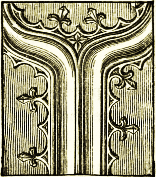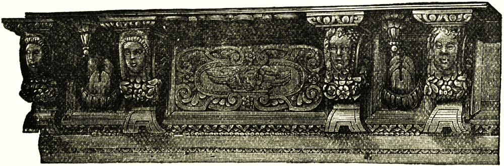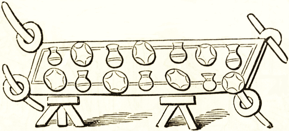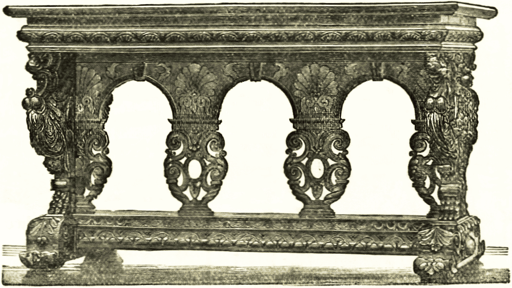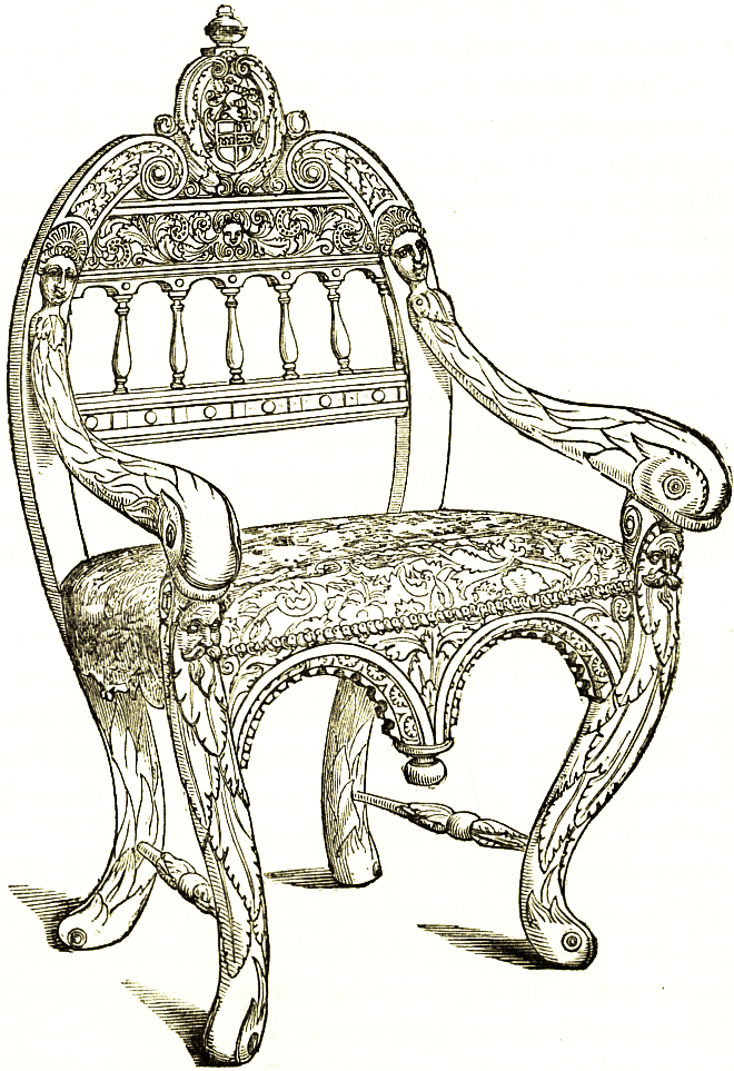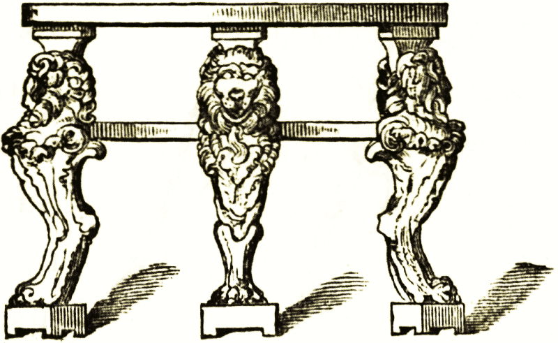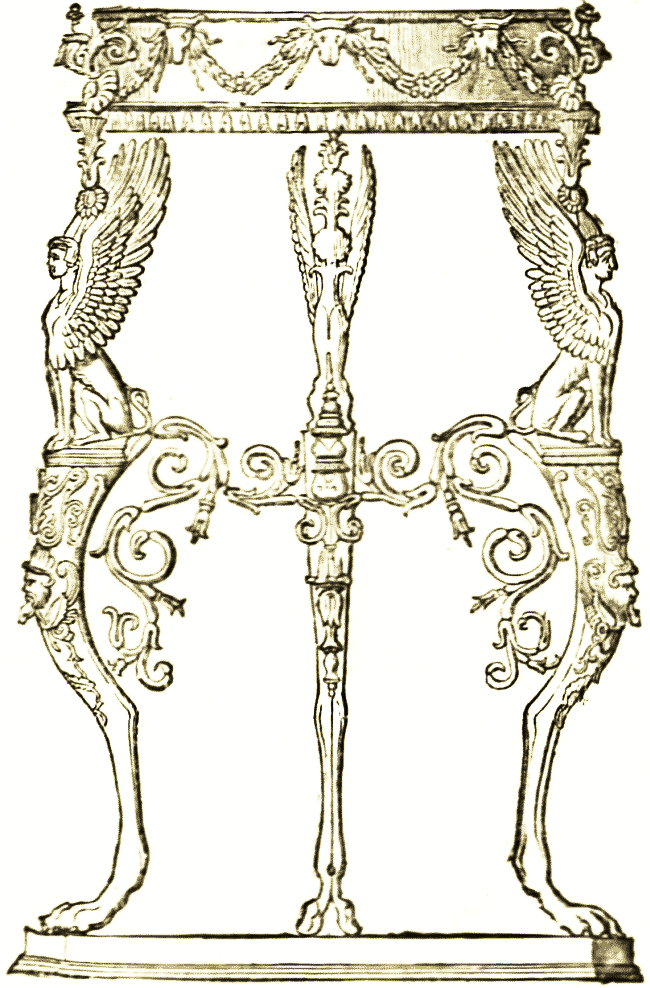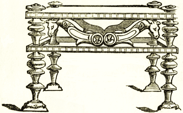 The tables seem in general to have been of similar form and decoration to the thrones or seats, the ends of the frame projecting and carved as in the woodcut above, only on a larger scale. The couches were of similar form, but made of gold and silver, stuffed and covered on the surface with the richest materials. The tables and the chairs were often made in the shape also found in Greece and Rome, with folding supports that open on a central rivet like our camp-stools, and like the curule chairs which were common not only in Rome but throughout Italy during the renaissance.