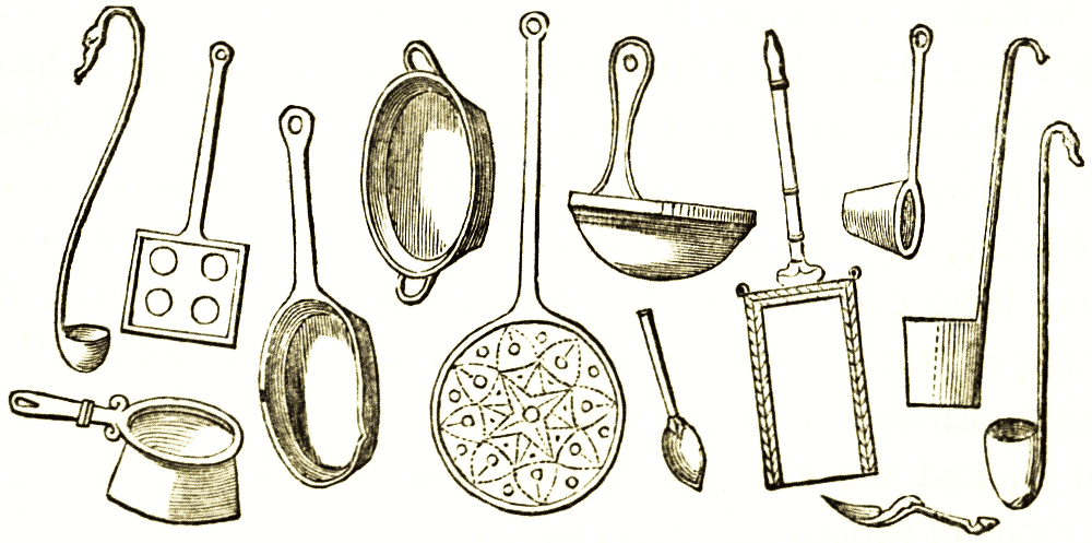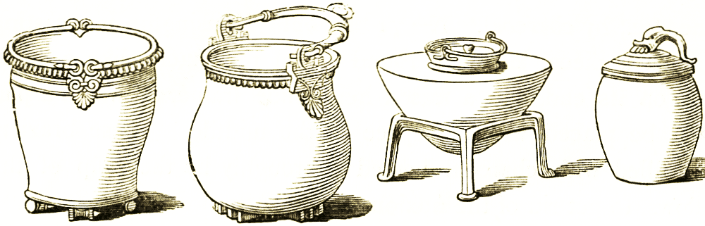 Closely connected with the dining-room was, it need scarcely be said, the kitchen; and we give woodcuts of kitchen utensils, from the originals preserved at Naples.
