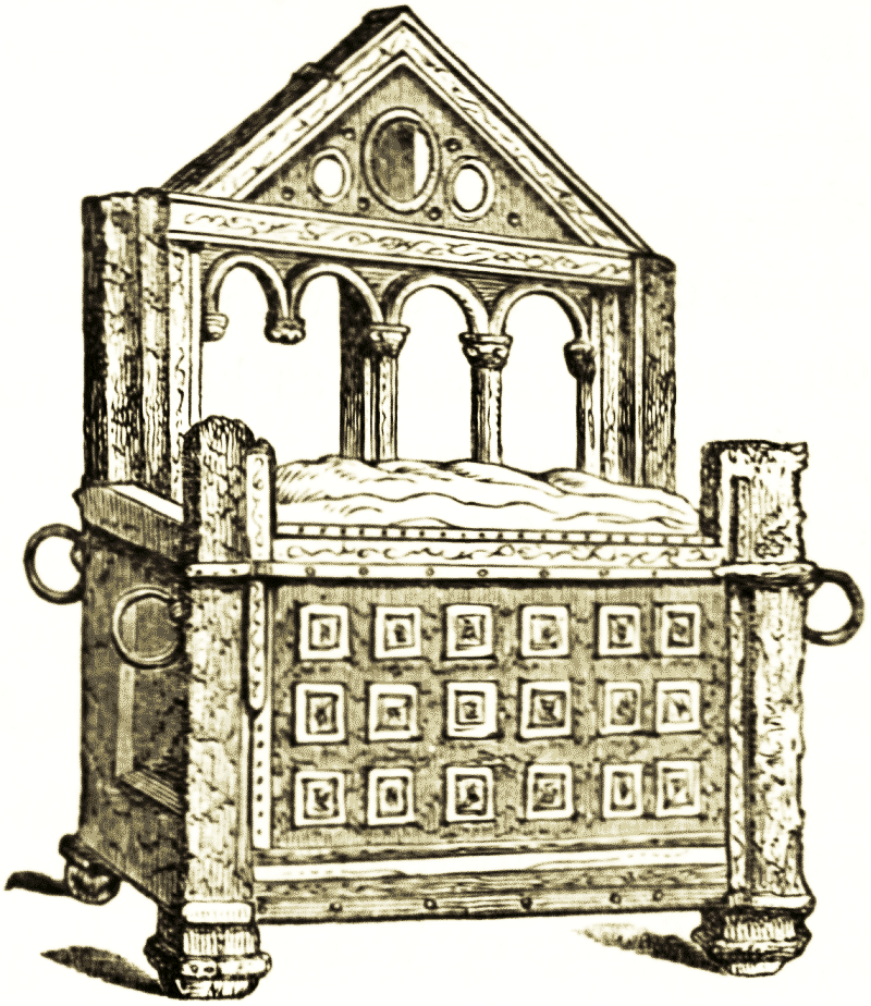 The chest or coffer in which Cypselus of Corinth had been concealed was seen by Pausanias in the temple of Olympia. It was made about the middle of the sixth century B.C. The chest was of cedar, carved and decorated with figures and bas-reliefs, some in ivory, some in gold or ivory partly gilt, which were inlaid on the four sides and on the top. The subjects of the sculpture were old Greek myths and local legends, and traditions [pg 12] connected with the country. This coffer is supposed to have been executed by Eumelos of Corinth.