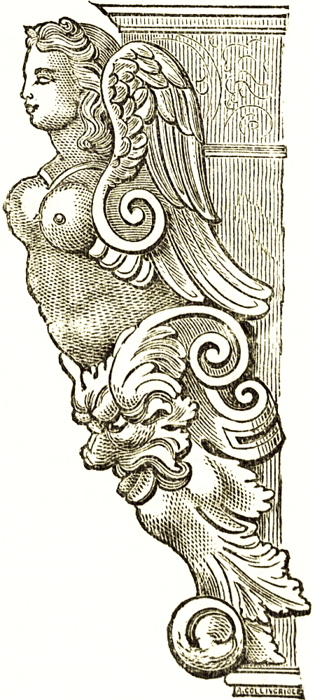 The subjects of the carving and ornamentation of Roman furniture were the classic legends mainly derived from the Greek mythology. Roman house walls were, however, in later years profusely decorated with conventional representations of architecture, [pg 32] and panels richly coloured on which were painted figures of dancers, cupids, gods and heroes; sometimes commonplace landscapes and domestic scenes. Their solid furniture was decorated with masks, heads of heroes, legs and feet of animals, and foliage, generally the leaves of the acanthus, of an architectonic kind.