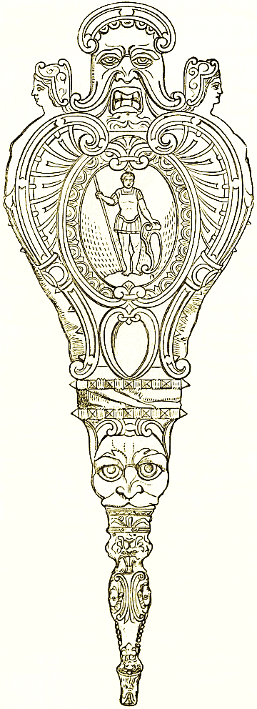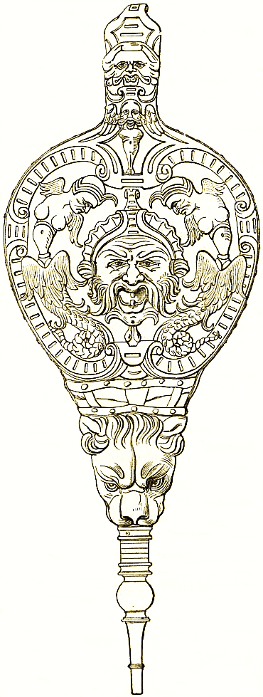 Mirrors of mixed metal alloys, silver, tin, and copper, have come down to our times in great numbers. They were made occasionally in pure silver, and in gold probably among the Greeks as they were in later times among the Romans. The cases are of bronze, and engraved with figure designs of the highest character. There is, however, no proof that these were used as furniture in houses, as in Rome. They are hand mirrors, and the description of them, as works of art, belongs rather to [pg 14] that of antique bronzes. The woodcut shows the usual type, with the richly ornamented handle.