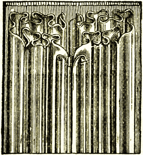 For carpentry and joiner's work, cedar was the wood most in demand. Pine of different kinds was used for doors, panels, carriage building, and all work requiring to be joined up with glue, of which that wood is particularly retentive. Elm was [pg 33] employed for the framework of doors, lintels and sills, in which sockets were formed for the pins or hinges on which the doors turned. The hinge jambs were occasionally made of olive. Ash was employed for many purposes; that grown in Gaul was used in the construction of carriages on account of its extreme suppleness and pliancy. Axles and portions which were much morticed together were made of Ilex (Holm oak). Beech also was in frequent use. Acer (Maple) was much prized, as has been already stated, for tables, on account of the beauty of the wood and of the finish which it admits. Osiers were in use for chairs as in our own times. Veneering was universal in wood furniture of a costly kind. The slices of wood were laid down with glue as in modern work, and they used tarsia or picture work of all kinds. Figwood, willow, plane, elm, ash, mulberry, cherry, cork wood, were amongst the materials for the bed or substance on which to lay such work. Wild and cultivated olive, box, ebony (Corsican especially), ilex, beech, were adapted for veneering boxes, desks, and small work. Besides these, the Romans used the Syrian terebinth, maple, palm (cut across), holly, root of elder, poplar; horn, ivory plain and stained; tortoiseshell; and wood grained in imitation of various woods for veneering couches and other large pieces of furniture, as well as door frames, &c., so that this imitation of grains is not entirely a modern invention. Woods were soaked in water or buried under heaps of grain to season them; or steeped in oil of cedar to keep off the worms. The cedars of Crete, Africa, and Syria were the best of that class of timber. The best fir timber was obtained from the Jura range, from Corsica, Bithynia, Pontus, and Macedonia.