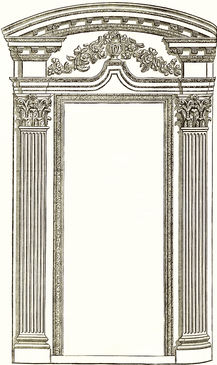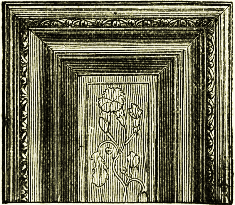 Besides the inlaid door frames, the ceilings of all the Roman rooms were very richly decorated. In more simple constructions the wood joists of the floor above, or the structure of the roof when no room surmounted it, were shown and painted; but in richer houses the timbers were covered with boards, and formed into coffers and panels, painted, gilt, and inlaid with ivory. This splendid system of decoration dates from the destruction of Carthage. Curved bearers from the upper part of the walls were added to form one kind of ceiling (camara), for which Vitruvius [pg 22] gives directions; and glass mosaics, like those used in the pavements, were inlaid on a plaster bed in the coffers. The cornices were of carved wood, or of plaster carved or modelled; the wood was always covered with a preparation of gesso, and gilt and painted like the walls.