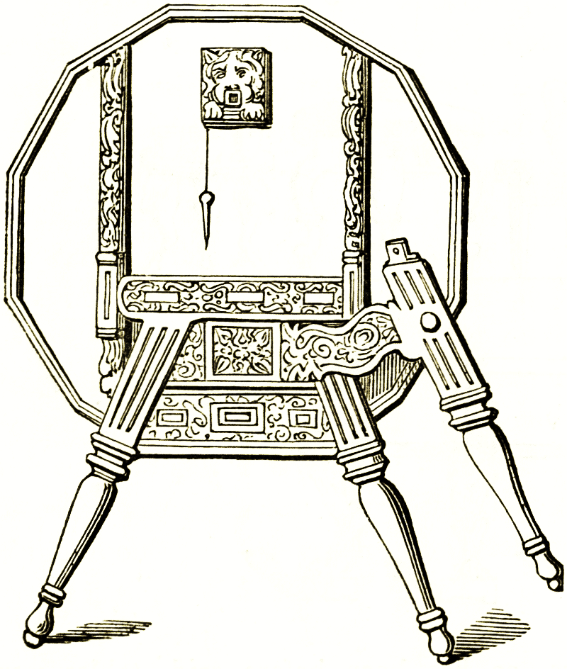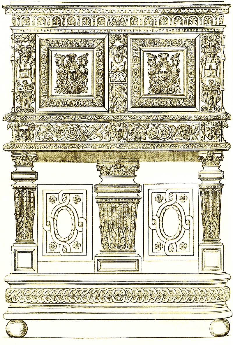 The study of a collection of old furniture has an interest beyond the mere appreciation of the beauty it displays. The carving or the ornaments that decorate the various pieces and the skill and ingenuity with which they are put together are well worthy of our attention. A careful examination of them carries us back to the days in which they were made and to the taste and manners, the habits and the requirements, of bygone ages. The Kensington museum, for example, contains chests, caskets, cabinets, chairs, carriages, and utensils of all sorts and of various countries. Some of these have held the bridal dresses, fans, and trinkets of French and Italian beauties, whose sons and daughters for many generations have long gone to the dust; there are inlaid folding chairs used at the court of Guido Ubaldo, in the palace of Urbino, and of other Italian princes of the fifteenth century; buffets and sideboards that figured at mediæval feasts; boxes in which were kept the jesses and bells of hawks; love-tokens of many kinds, christening-spoons, draught and chess men, card boxes, belonging to the fifteenth, sixteenth, and seventeenth centuries; carriages of the London of Cromwell and Hogarth, and of the Dublin of Burke; panelling of the date of Raleigh; a complete room made for a lady of honour to Marie Antoinette.