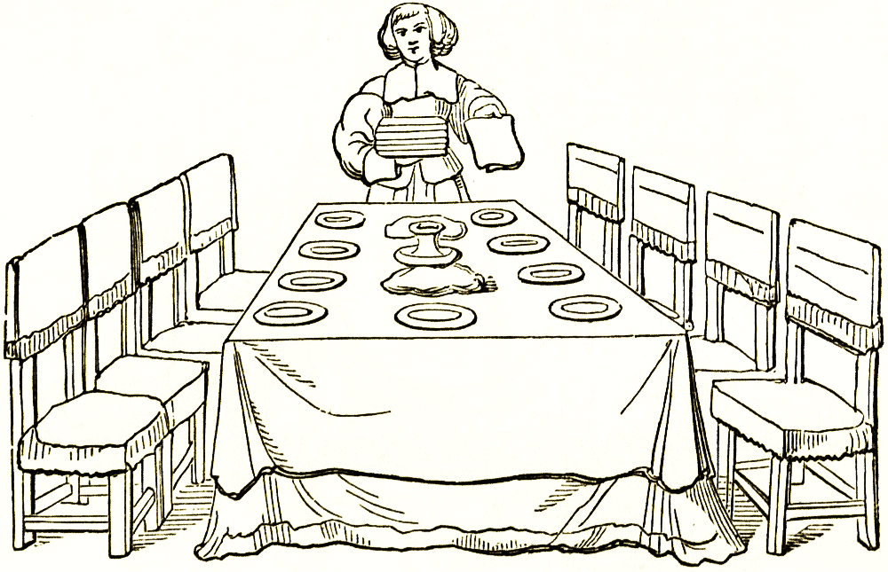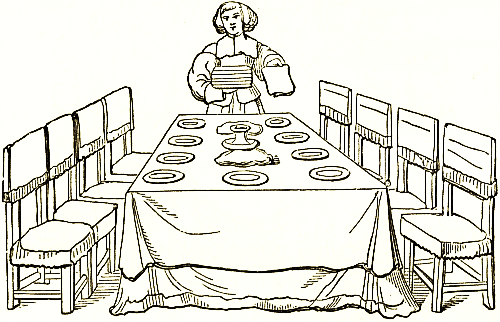 The most important action of the luxurious Roman day was the dinner. Couches were arranged for the guests, and the room was further provided with stools or low benches, side tables, and the movable table used for each course. These tables were put down and removed from the supports on which they stood. The [pg 30] side tables were of marble or of wood, covered with silver plates, inlaid, veneered, and ornamented in various ways; some were used for serving the dishes, others for the display of plate.