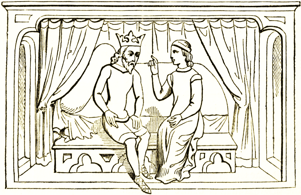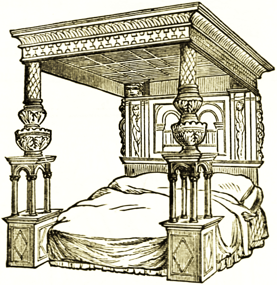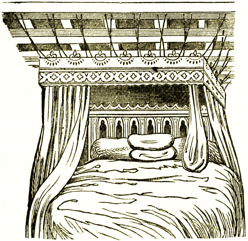 Of Hebrew furniture we can give few details. It is probable that the Jews differed but little from the Assyrians in this respect. The throne of Solomon has been already noticed. In the story [pg 9] of Judith the canopy and curtains of the bed of Holofernes may have been taken by the chronicler from familiar examples at home, or may have been strictly drawn from traditional details. In the figurative language of the Canticles, the bed of Solomon is of cedar of Lebanon, the pillars of silver, the bottom of gold. Ordinary bedroom furniture is spoken of in the Chronicles, when the Shunamite woman, a person of great wealth, built for the prophet Elias "a little chamber on the wall, and set therein a bed, a table, a stool, and a candlestick." Ivory wardrobes are mentioned in the 45th psalm, but of what size or form we cannot determine. In the book of Esther allusions are made to Persian furniture decorations, white, green, and blue hangings fastened with fine linen to silver rings and pillars of marble. The beds were of gold and silver, &c. The bed of Og, king of Bashan, was nine cubits long by four, and was of iron: it was preserved as a trophy.