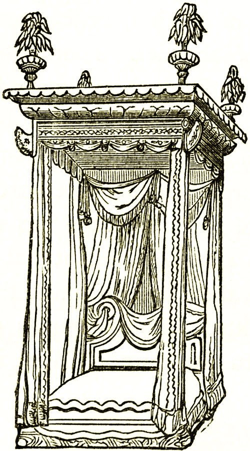 The Egyptians used couches straight, like ottomans; with head boards curving over as in our modern sofas, sometimes with the head and tail of an animal carved on the ends, and the legs and feet carved to correspond. These were stuffed and covered with rich material. The Egyptians did not recline at meals. Their double seats, δίφροι, or bisellia, were such as were used by the Greeks and Romans. They had shelves and recesses, chests and coffers, made of pine or cedar wood, and of a material still used in Egypt, the cafass—palm sticks formed into planks by thin pegs or rods of harder wood passing through a series of these sticks laid together. "Of their bedroom furniture," says Sir Gardner Wilkinson, "we know but little." They used (he tells us) their day couches probably, or lay on mats, and on low wooden pallets made of palm sticks. These last had curved blocks, which served for a pillow, forming a hollow to receive the head. Examples in alabaster and wood are in the Louvre and in the British museum.