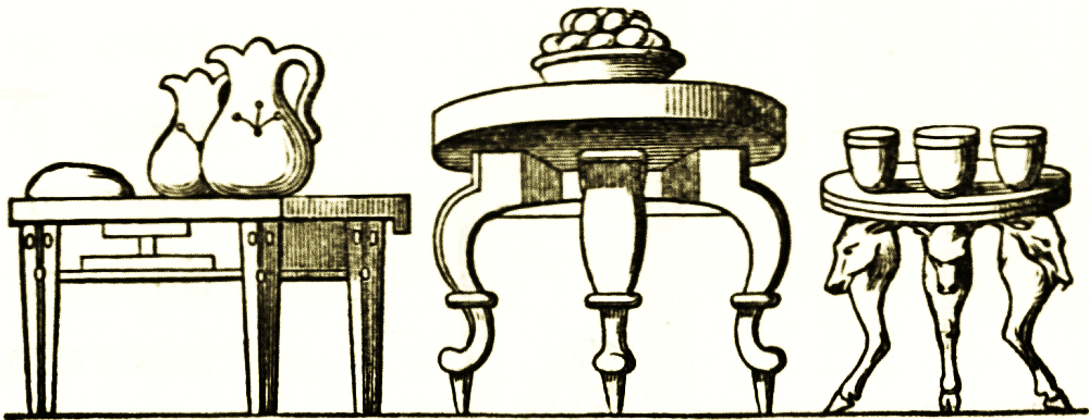 Tables were of many varieties in Rome, and enormous expenses were incurred in the purchase of choice pieces of such furniture. They were made of marble, gold, silver, bronze; were engraved, damascened, plated, and otherwise enriched with the precious metals; were of ivory, and of wood, and wood decorated with ivory; and in many other methods. Engraved (p. 26) is a very beautiful table found at Pompeii, and now at Naples. Tripods, terminal and other figures, made of bronze or marble; winged sphinxes, or leopards' and lions' legs, columns and other architectonic forms, were the supports on which these tables were fastened. Some had one central support only, in [pg 26] a few instances finished with animal heads of ivory. Abaci were small tables with raised rims to hold valuables.