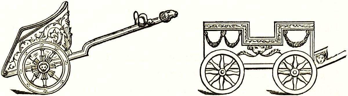The Greek chariot was of wood, probably similar to that of the Egyptians. It had sometimes wheels with four strong spokes only, as in the woodcut. The chariot wheel of the car of Mausolus, in the British museum, has six. The Ninevite wheels have sometimes as many as twelve, as may be seen in the sculptured bas-reliefs of the narrow Assyrian gallery of the British museum.