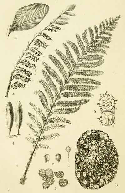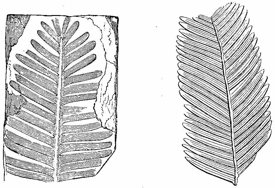 [8] In giving names to fossil Ferns, the Greek word πτερίς, meaning a Fern, is often used with a prefix indicating some character in the form of the leaves, or stem, or fructification: such as, πέκος, a comb; νεῦρον, a nerve; ὀδούς, a tooth; σφήν, a wedge; καυλός, a stalk or stem; κύκλος, a circle; σχίζω, a split, etc.