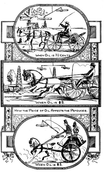 A dry-joke tickles and a dry-hole scrunches. It’s a poor mule won’t work both ways, a poor spouter that can’t keep its owner from going up the spout, a poor boil in the pot that isn’t better than a boil on the neck, a poor chestnut on the tree that doesn’t beat a chestnut at a minstrel show and a poor seed that produces no root or herb or grain or fruit or flower. “Who made you?” the 452Sunday-school teacher asked a ragged urchin. “Made me? Well, God made me a foot long and I growed the rest!” And so the early operators on Oil Creek made the oil-development “a foot long” and it “growed the rest.” The tiny seed is a vigorous plant, the puling babe a lusty giant. Amid lights and shadows, clouds and sunshine, successes and failures, struggles and triumphs, starless nights and radiant days, petroleum has moved ahead steadily. Growth, “creation by law,” is ever going on in the healthy plant, the tree, the animal, the mind, the universe. We must go forward if the acorn is to become an oak, the infant a mature man, the feeble industry a sturdy development. Progress implies more of involution than of evolution, just as the oak contains much that was not in the acorn, and the oil-business in 1898 possesses elements unknown in 1859. Not to advance is to go backward in religion, in nature and in trade. “An absentee God, sitting idle ever since the first Sabbath, on the outside of the universe, and seeing it go,” is not a correct idea of the All-Wise Being, working actively in every point of space and moment of time. Stagnation means decay in the natural world and death in oil-affairs. The man who sits in the pasture waiting for the cow to come and be milked will never skim off the cream. The man who wants to figure as an oil-operator must bounce the drill and tap the sand and give the stuff a chance to get into the tanks. Still a youngster in years, the petroleum-colt has distanced the old nags. The sucker-rod is the pole that knocks the persimmons. The oil-well is the fountain of universal illumination. The walking-beam is the real balance of trade and of power. The derrick is the badge of enlightenment. Petroleum is the bright star that shines for all mankind and doesn’t propose to be snuffed out or shoved off the grass. Its past is known, its present may be estimated, but what Canute dare fence in its future and say: “Thus far shalt thou come and no farther?”